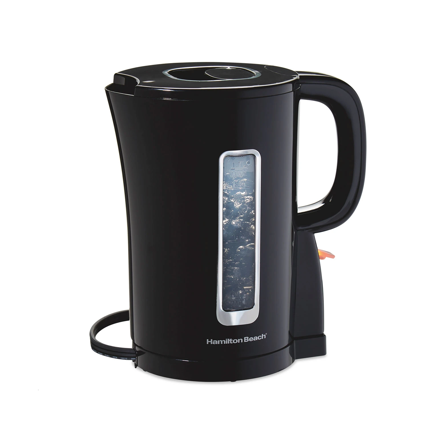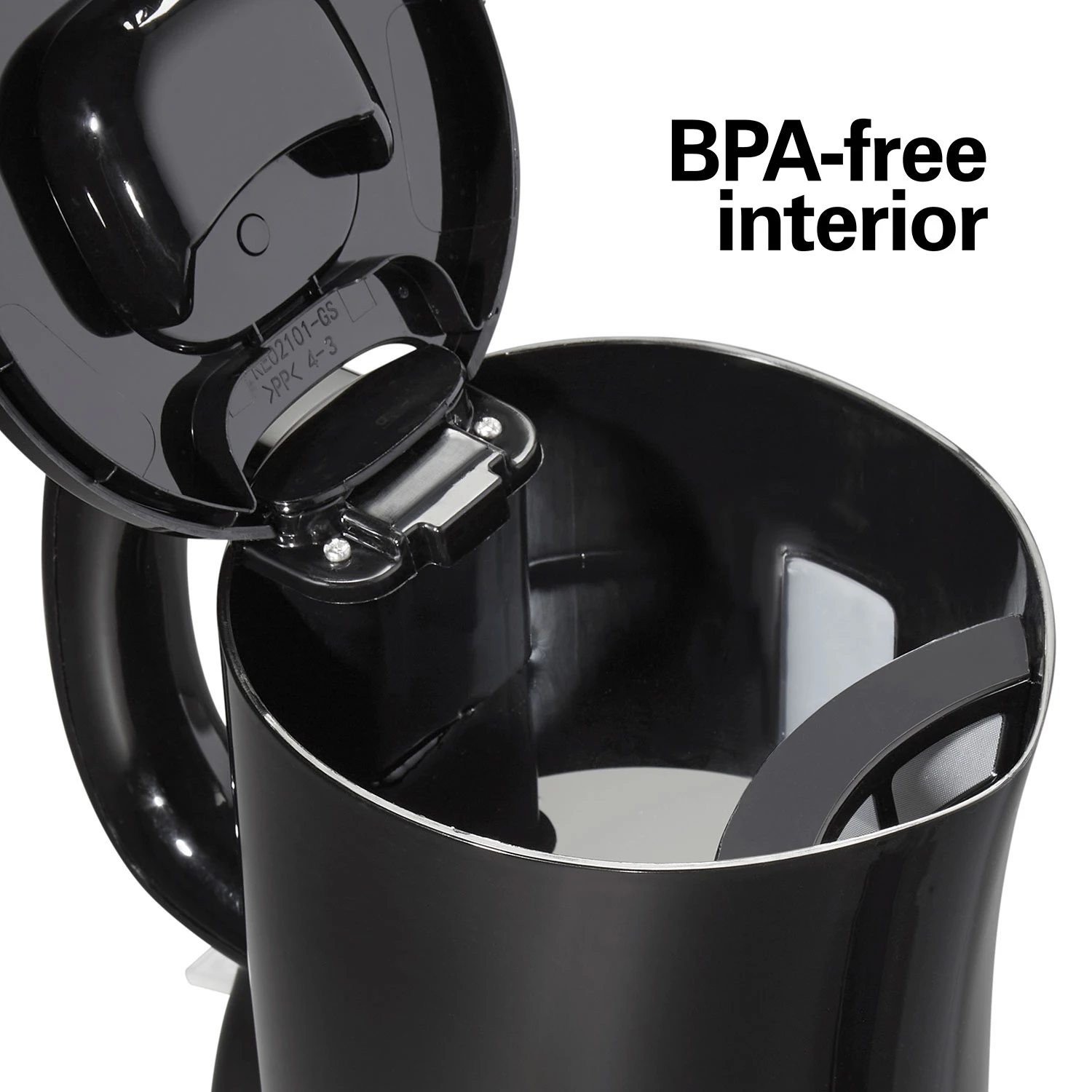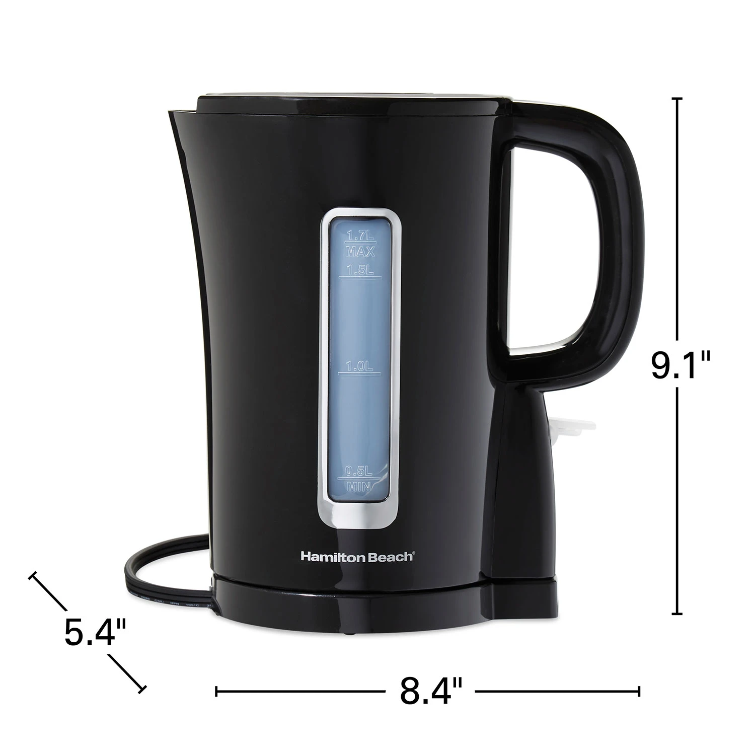 Bring style and performance to your kitchen with the Hamilton Beach® 1.7 L Electric Kettle. This attractive black kettle has stylish metallic trim that complements any decor, and it features automatic shutoff for peace of mind. For worry-free operation and rapid boiling, the kettle has a BPA-free interior and 1500 watts of power for 35% faster boiling.* It’s fast and easy to use. Simply fill with water and flip down the on/off switch near the base.