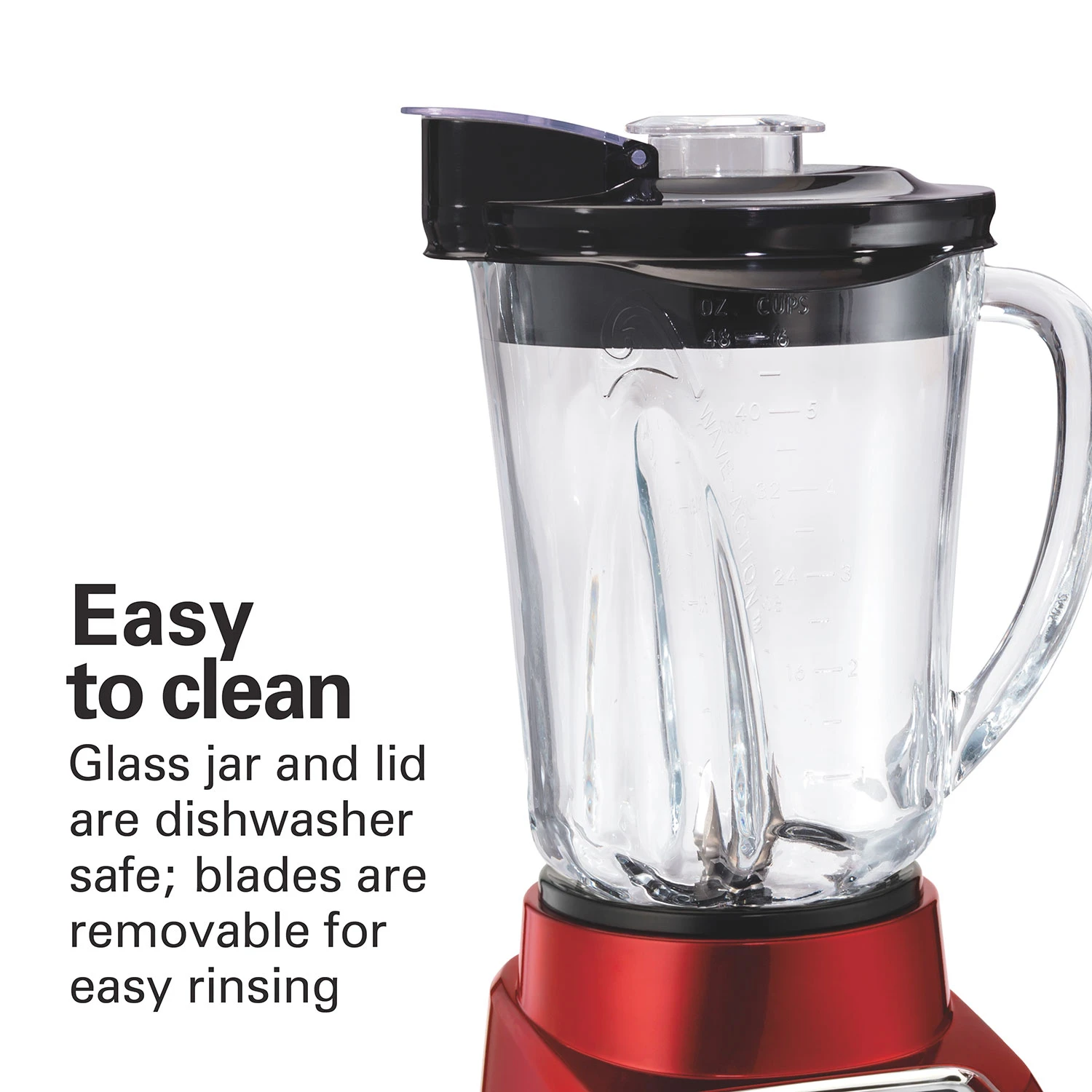 The blender base has a new and improved patented design engineered to dampen motor noise, so you can make morning smoothies without making a lot of fuss. The durable glass blending jar holds 48 ounces and is BPA free. Measuring lines on the front of the jar eliminate guesswork. The convenient pour spout on the jar reduces messy drips when pouring to make serving easy, while the filler cap on the jar lid is removable so you can easily add ingredients while blending. A tamper is included to ensure frozen and thick mixtures are blended to the perfect consistency. It doubles as a measuring spoon. The smoothie blender includes a 3 year limited warranty from Hamilton Beach.
