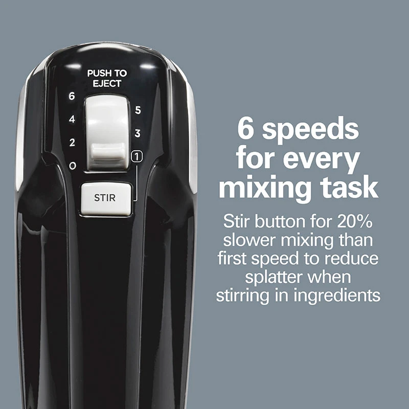 The electric hand mixer has 6 speeds for a wide range of mixing tasks. Push the Stir button for a speed that’s 20% slower than first speed to reduce splatter when stirring in dry ingredients or combining liquids.