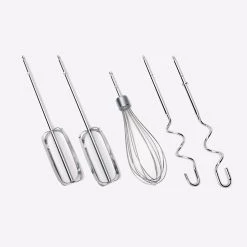 This modern, lightweight kitchen hand mixer comes with everything you need to start mixing: 2 traditional beaters and a whisk. After mixing, all 3 attachments go in the dishwasher for easy cleanup.