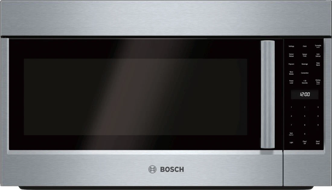 Enhance your kitchen with this over-the-range microwave by Bosch. With 1.8 cu. ft. of capacity and 1,000 watts of power, you’ll be able to prepare a variety of meals. The microwave oven’s convection cooking capability allows it to be used as a second oven. A sensor detects when food is done cooking and will automatically turn off. The automatic defrost feature determines the power level and cooking time. The multi-speed vent efficiently removes steam, smoke, grease, and odors. The stainless steel cavity is durable and makes clean-up a breeze.