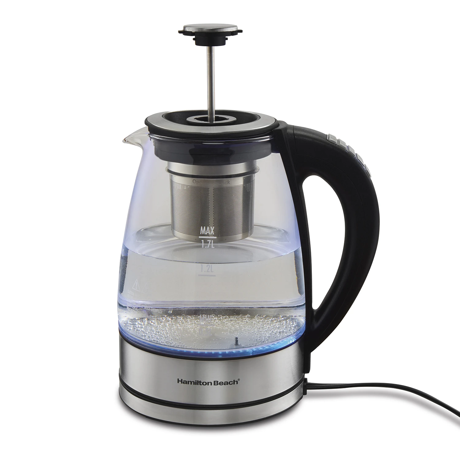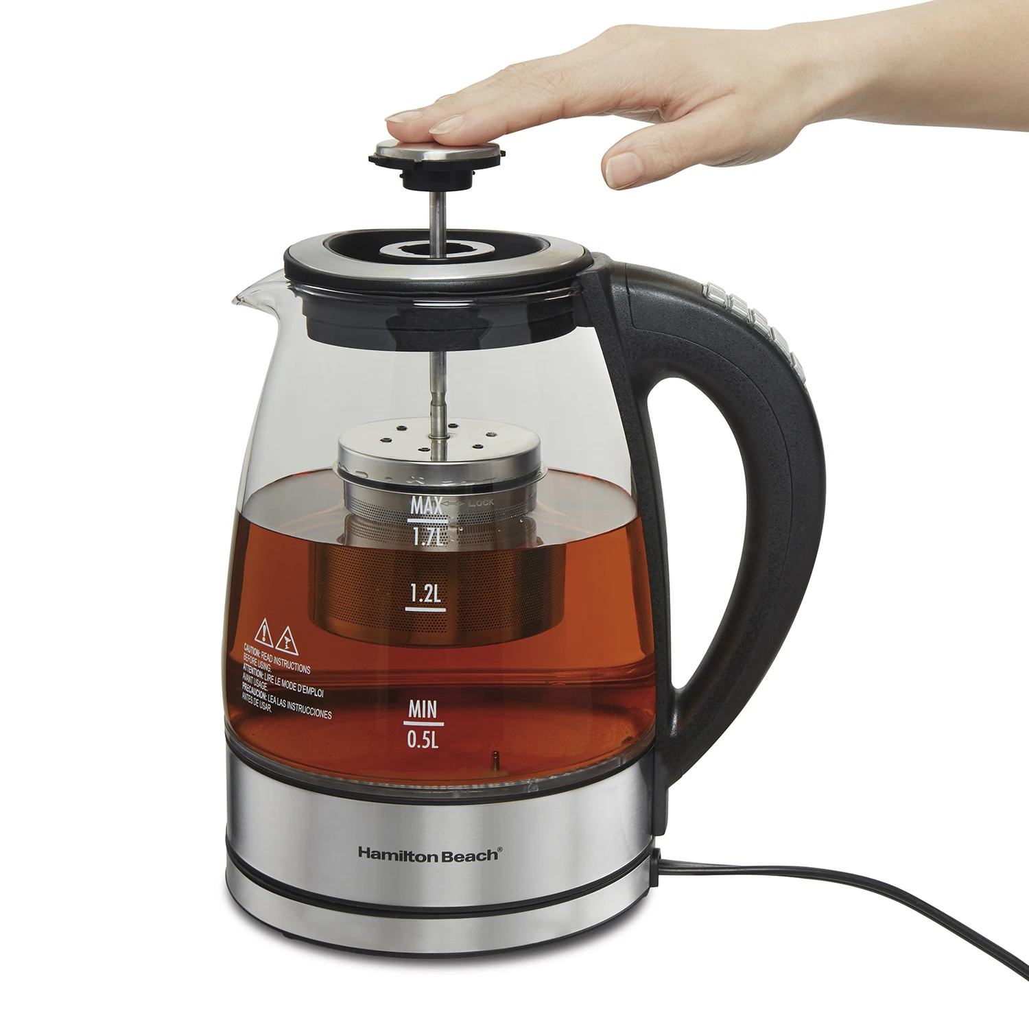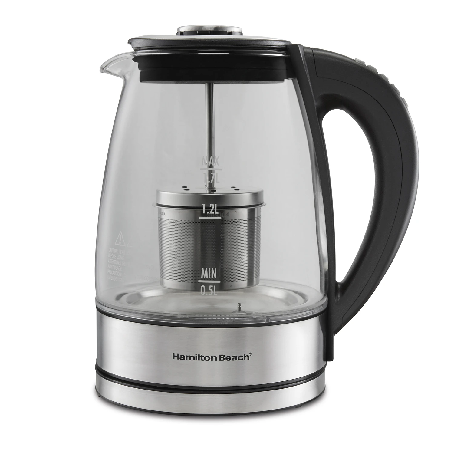 The Hamilton Beach® Variable Temperature 1.7 L Glass Kettle with Tea Infuser provides fast boiling thanks to 1500 watts of power. The 6 temperature presets provide guess-free heating by bringing water up to the perfect temperatures for delicate, green, white, oolong and black teas as well as French press coffee and hot cocoa. You can heat water to a specific temperature with the touch of a button and create your favorite hot beverages with confidence. With the tea infuser, you can heat water and steep tea in the same container. You’ll be able to pour yourself multiple cups without reheating the water because the keep warm setting maintains the water’s temperature for 30 minutes. This attractive 1.7 liter kettle is made of durable borosilicate glass for long-lasting performance and it has automatic shutoff and boil-dry protection for your peace of mind. Convenient cord-free serving makes it easy to pour beverages at the table.