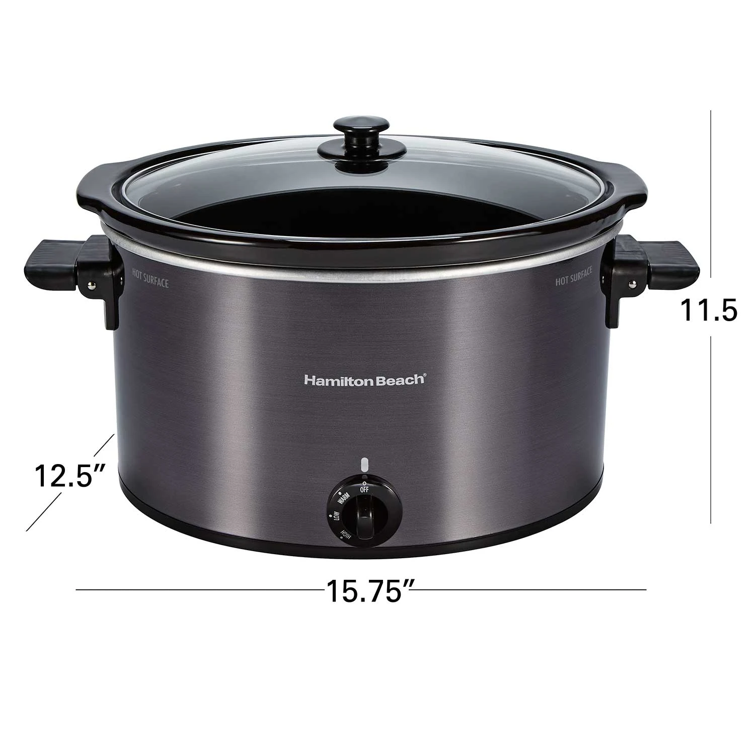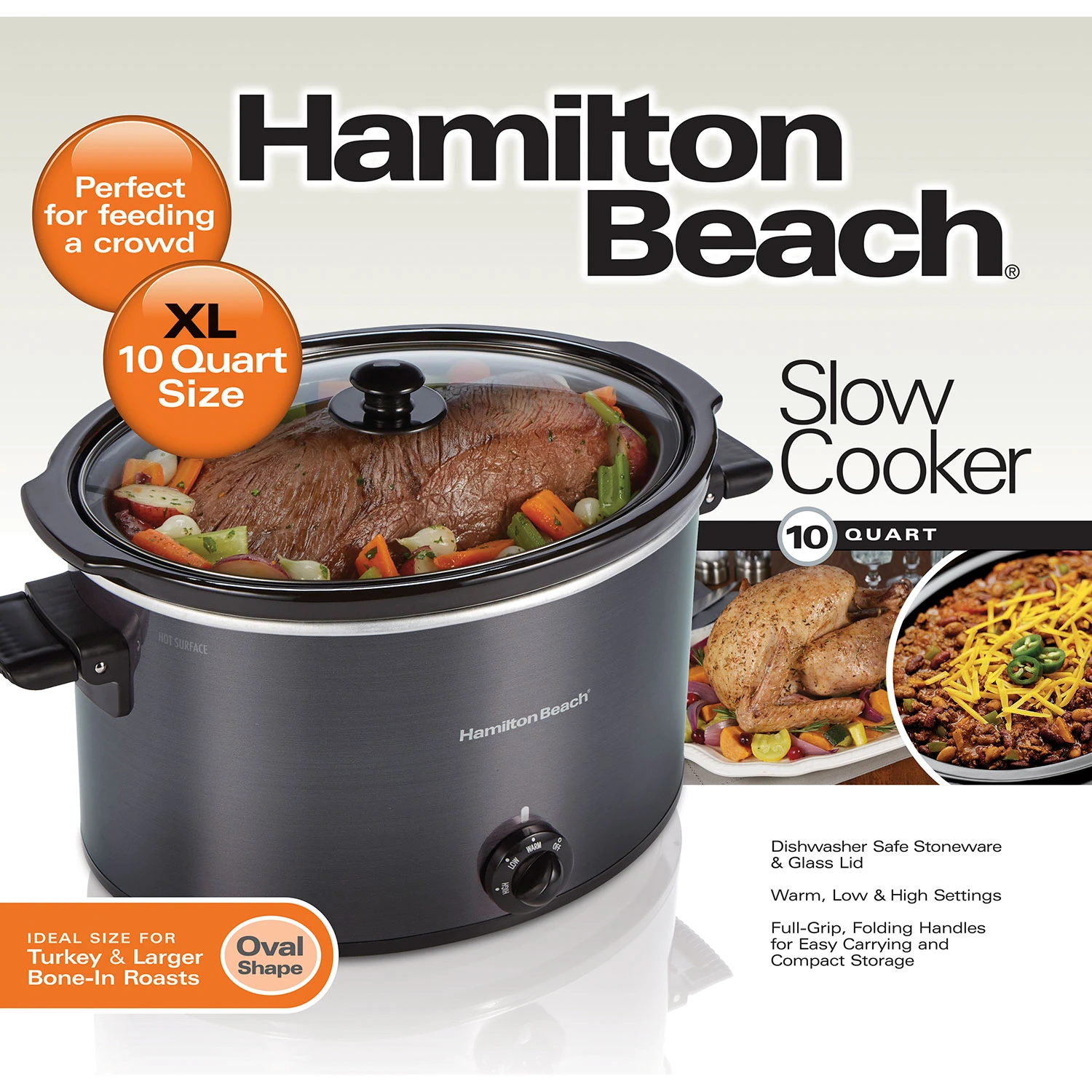 The Hamilton Beach® 10 Quart Slow Cooker’s extra-large capacity is perfect for everything from game-day chili to your Thanksgiving turkey. The oval-shaped stoneware crock can fit up to a 10 lb. turkey or 12 lb. roast and is perfect for large-batch soups and stews. This slow cooker features low and high cook settings and a warm setting, ideal for buffets or when dinner ends up later than you planned. Full-grip, folding handles make it easy to carry, and both the stoneware crock and glass lid are dishwasher safe.