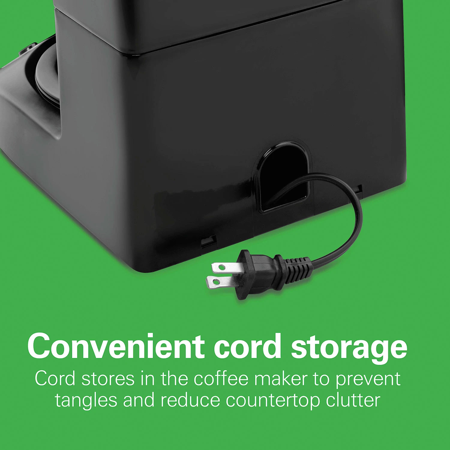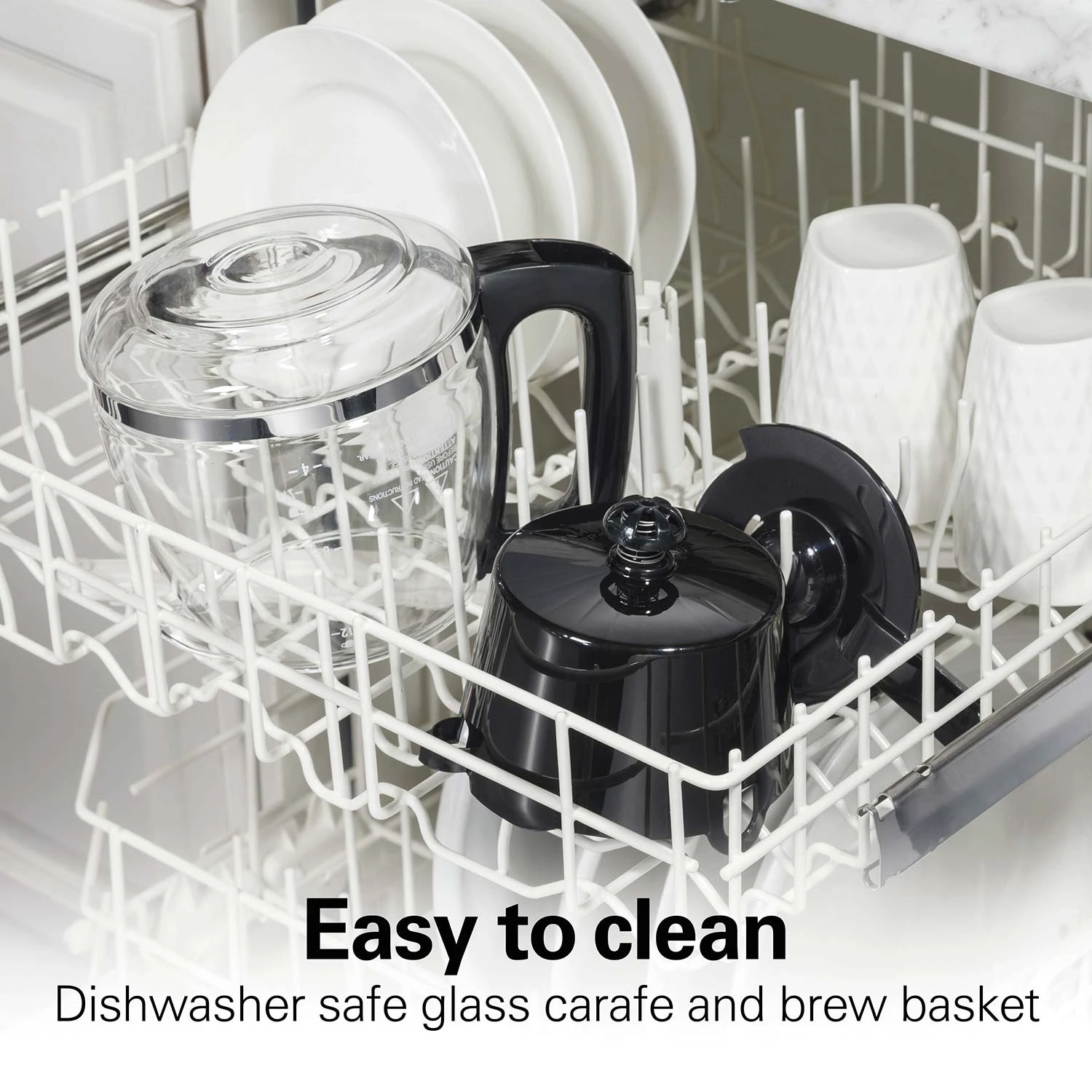 The borosilicate glass carafe and removable brew basket of this Hamilton Beach coffee maker are dishwasher safe for easy cleanup.