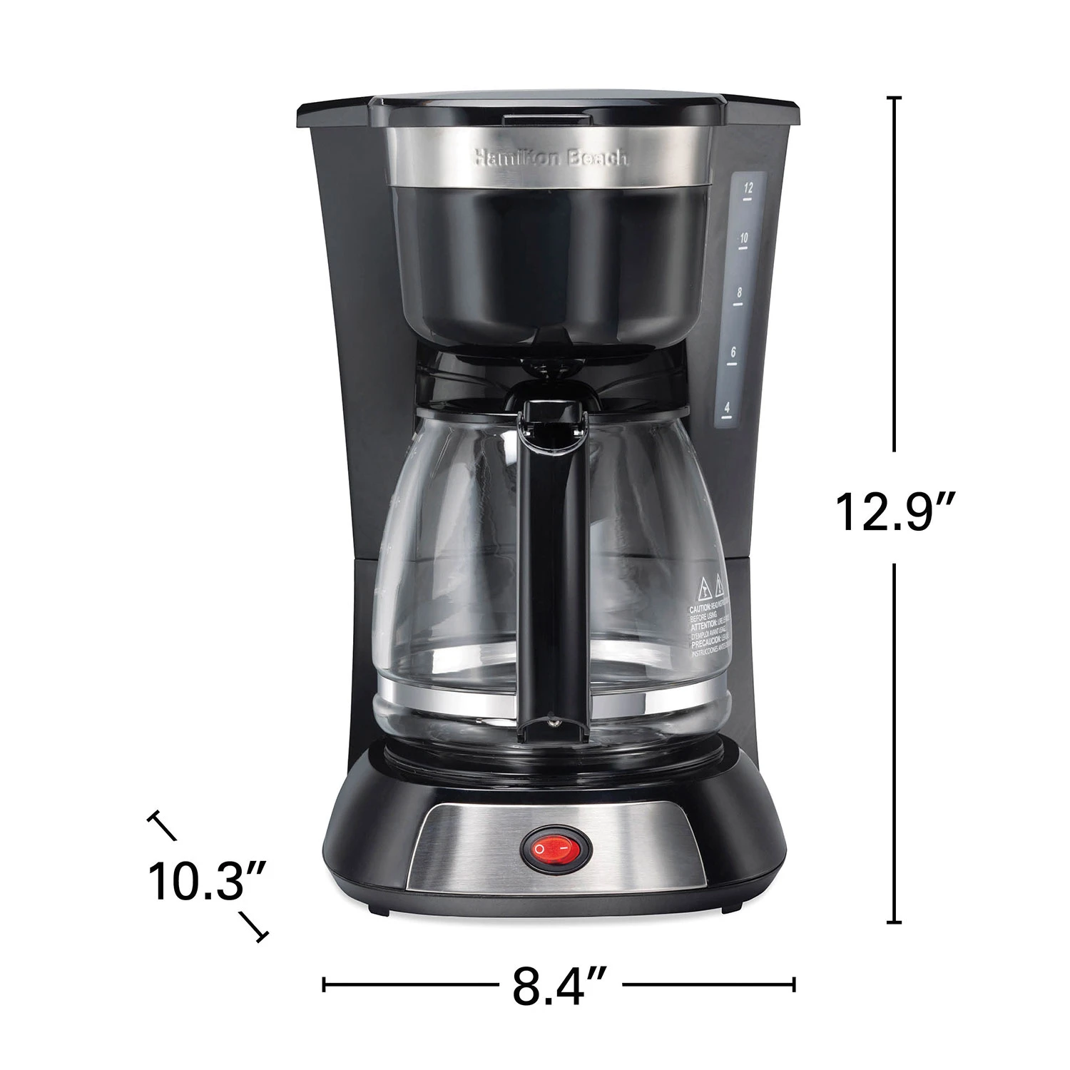 Easily brew your daily coffee with a sleek black & stainless coffee maker that looks great in your kitchen. The Hamilton Beach® 12 Cup Coffee Maker with stainless steel accents is stylish and easy to use. Just add coffee, water and start brewing by pressing the on/off switch. The illuminated switch stays lit until you turn it off, so it reminds you at a glance when the coffee maker needs to be turned off. While coffee brews, you can get your first cup fast with Auto Pause & Pour, which briefly stops the flow of coffee when you lift the carafe. Besides being easy to use, this coffee maker is easy to clean — the glass carafe and brew basket are dishwasher safe. You can easily fill the water reservoir without messy splashes, and the large view window makes it easy to keep track of the water level. To simplify your morning routine, the Hamilton Beach 12 Cup Coffee Maker is smart plug compatible, which works with Alexa, Google Home or Siri to voice control or add to your routines (smart plug sold separately).