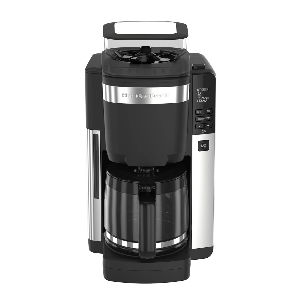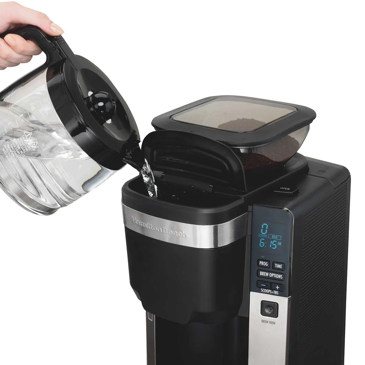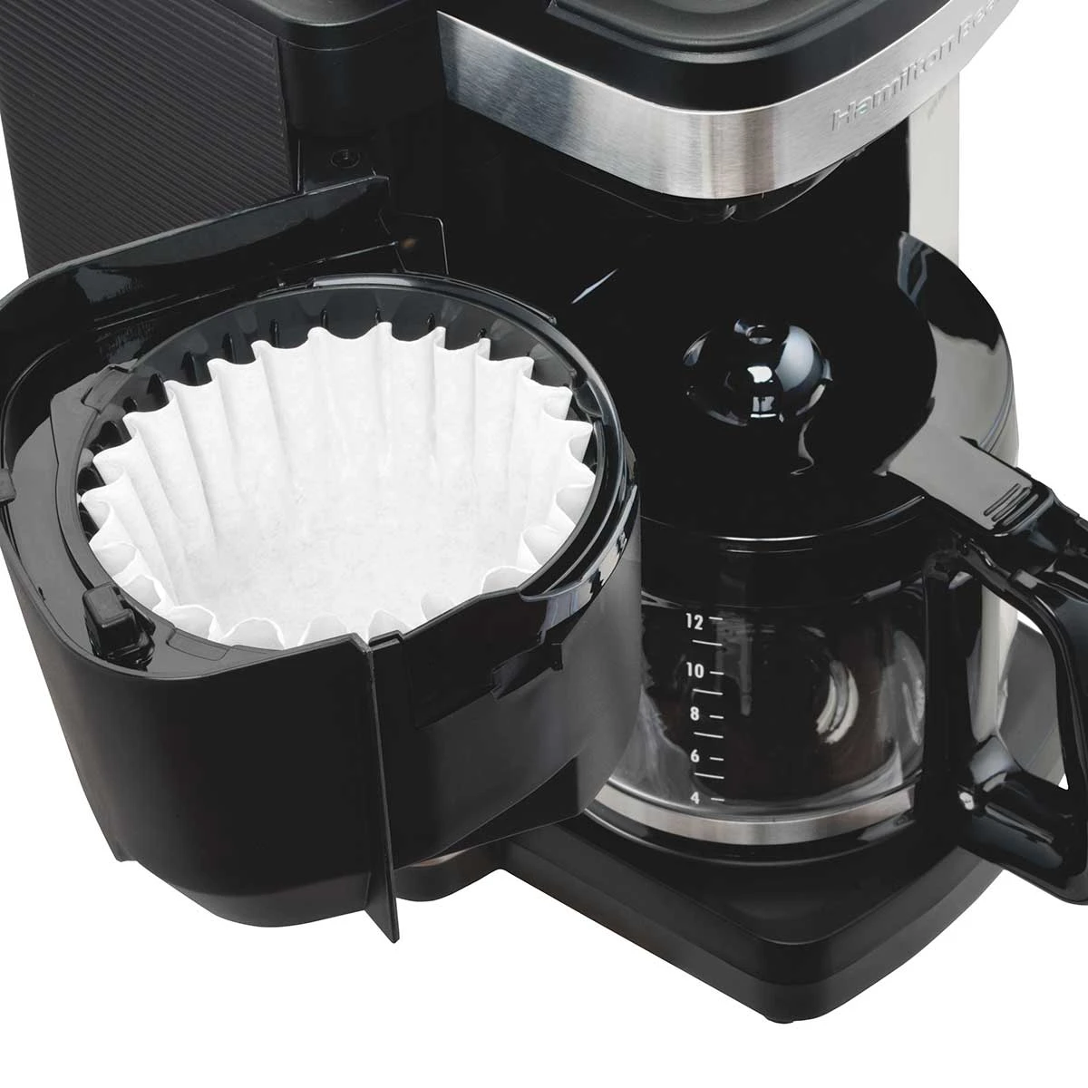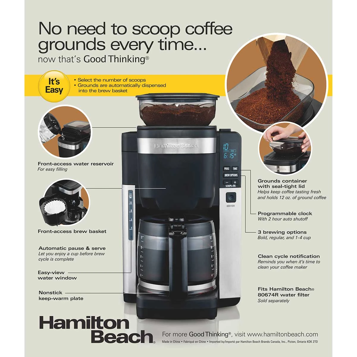 With the Hamilton Beach® Auto Grounds Dispensing Coffee Maker, making coffee just got a whole lot easier. That’s because your grounds are automatically measured and dispensed into the filter with just a touch of a button. Plus, it remembers your scoop number so there’s no need to set it daily. That means you can get the same flavor and strength every time – no matter who makes it.