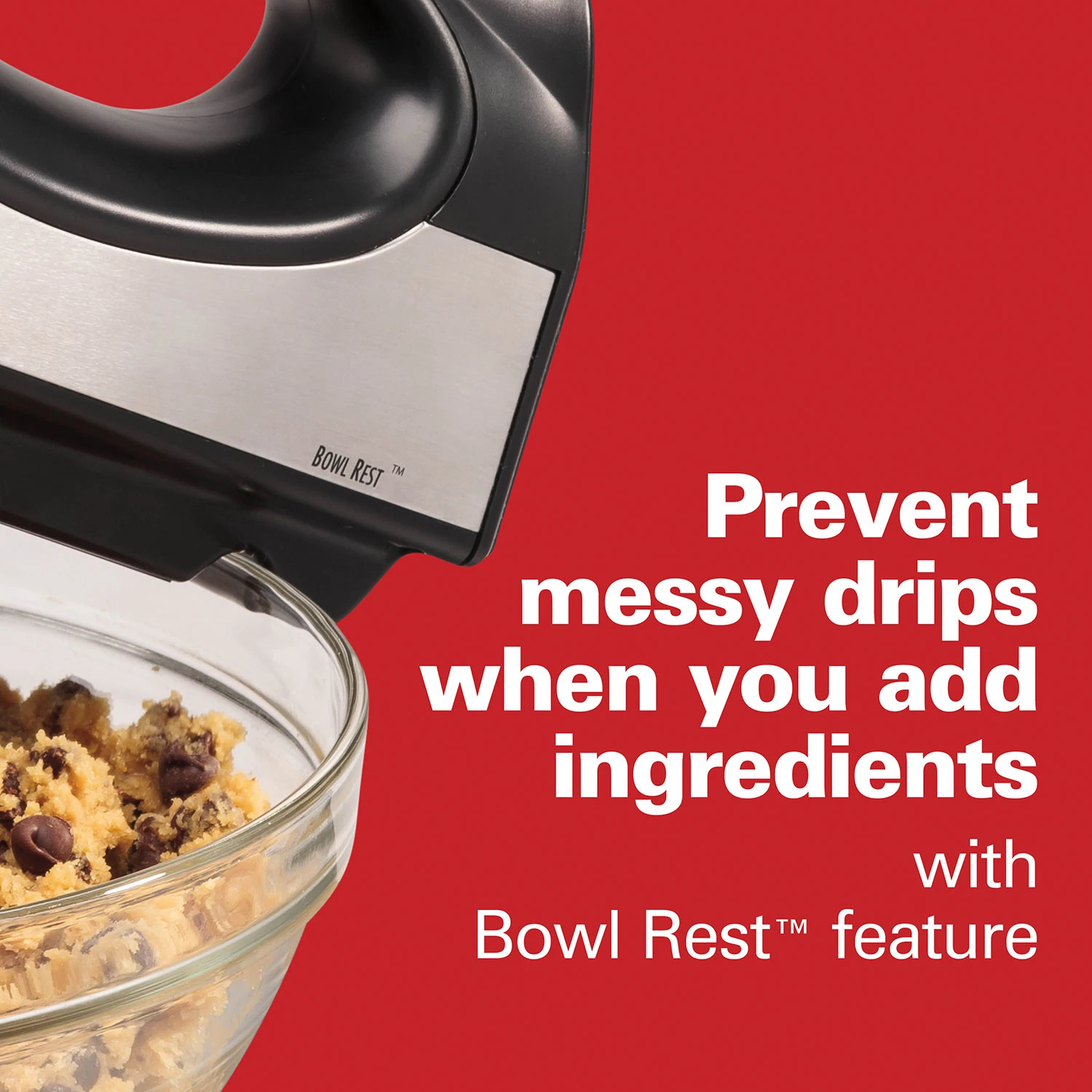 Whip up a fluffy meringue for a lemon pie or prepare hearty dough for a homemade pizza with the Hamilton Beach® 6 Speed Hand Mixer with Quick Burst™ Button. For fast, easy mixing, it has 6 speeds plus a QuickBurst™ button to provide additional power at any speed. Since it includes 5 mixing attachments, this versatile mixer is your go-to appliance for mixing, folding, whipping and kneading all your favorite recipes. This stylish mixer comes with a storage case that fits all the attachments and the mixer perfectly. The 2 traditional beaters take on cookie dough and cake batter with ease. If you’re making bread, the 2 dough hooks help you knead the ingredients thoroughly. For whipping cream or beating egg whites, the whisk provides light, airy results every time. Mixing control and power are at your fingertips with 300 watts of power and a rubber grip handle, and the attractive stainless steel body goes with any decor. To make it easier to rest the mixer when adding additional ingredients, the Hamilton Beach® 6 Speed Hand Mixer With Quick Burst™ Button features a convenient Bowl Rest™ feature.