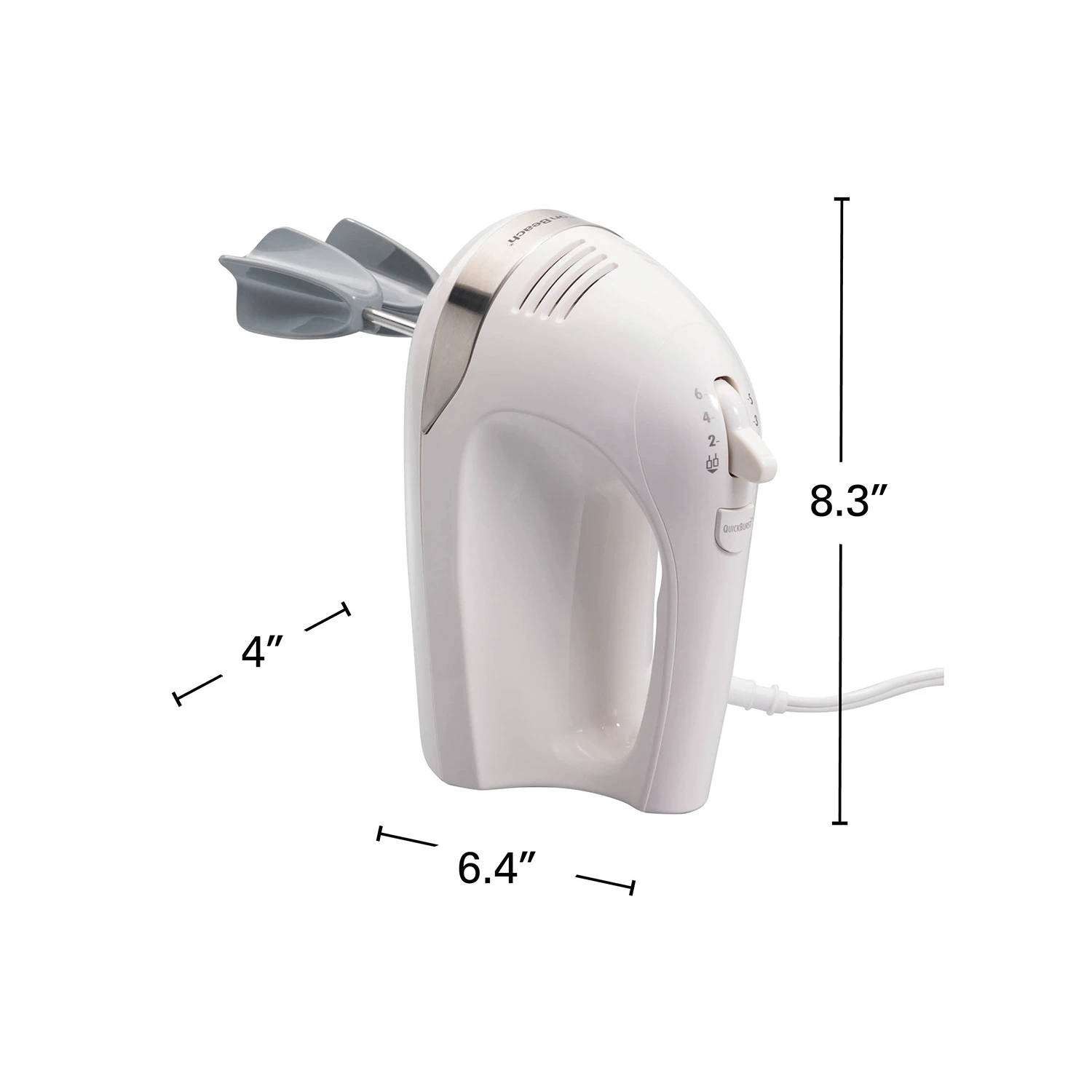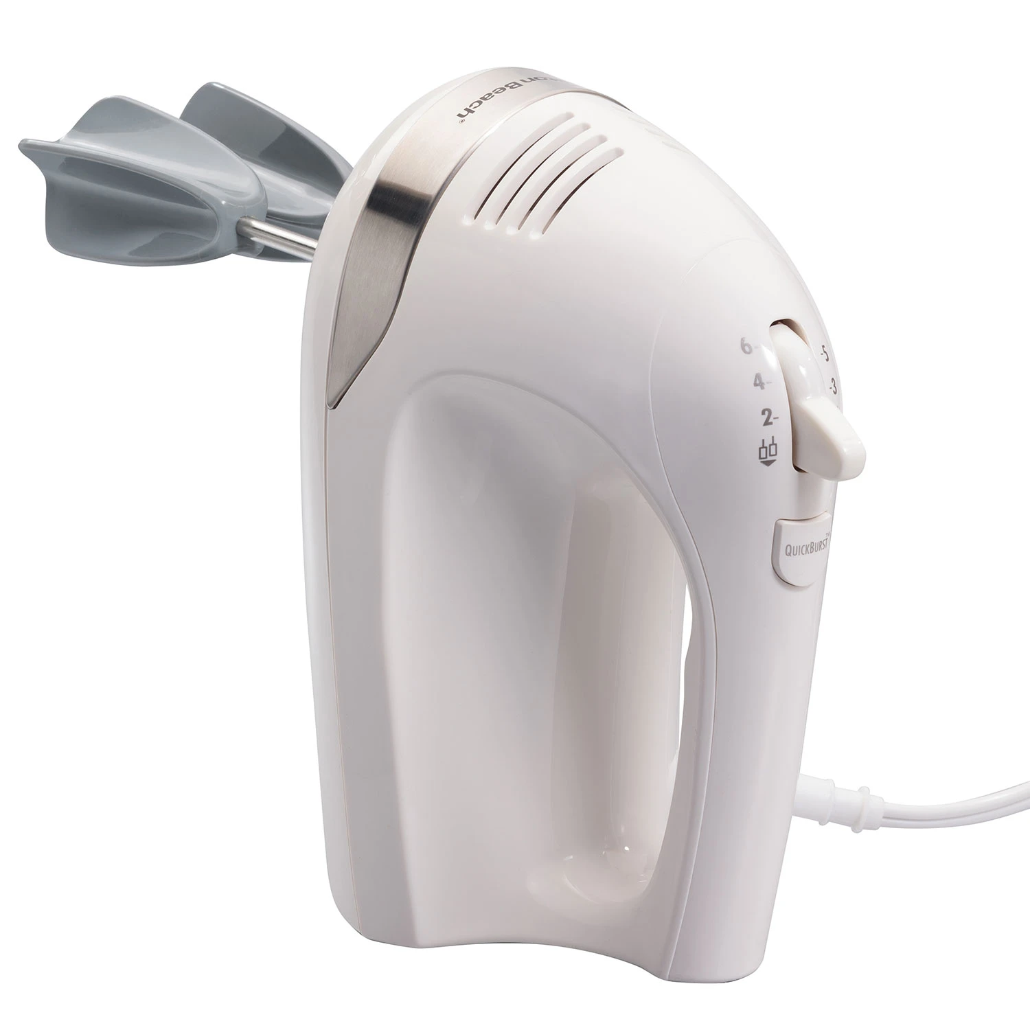 Mix your recipes effortlessly with the Hamilton Beach® 6 Speed Hand Mixer with Easy Clean beaters. The innovative Easy Clean beaters reduce clogging and provide great mixing performance. In addition to a convenient snap-on storage case, the Hamilton Beach 6 Speed Hand Mixer comes with 7 versatile attachments: 2 Easy Clean beaters, 2 traditional beaters, 2 dough hooks and a whisk. The snap-on storage case holds the included attachments, reducing the chance that they’re lost or misplaced. This powerful hand mixer has 275 watts of peak mixing power to get the job done, whether you’re mixing cookies, kneading bread dough, or whipping cream to top a pie. The mixer’s 6 speeds provide a wide range of mixing options for all your recipes, plus the QuickBurstâ„¢ function provides an extra burst of power at every speed. If you need to step away from the mixer for a moment or free your hands to add ingredients, the Bowl Restâ„¢ feature lets you rest the mixer on the side of the bowl. After mixing, the beater eject makes it easy to remove the attachments, which are dishwasher safe for easy cleanup.