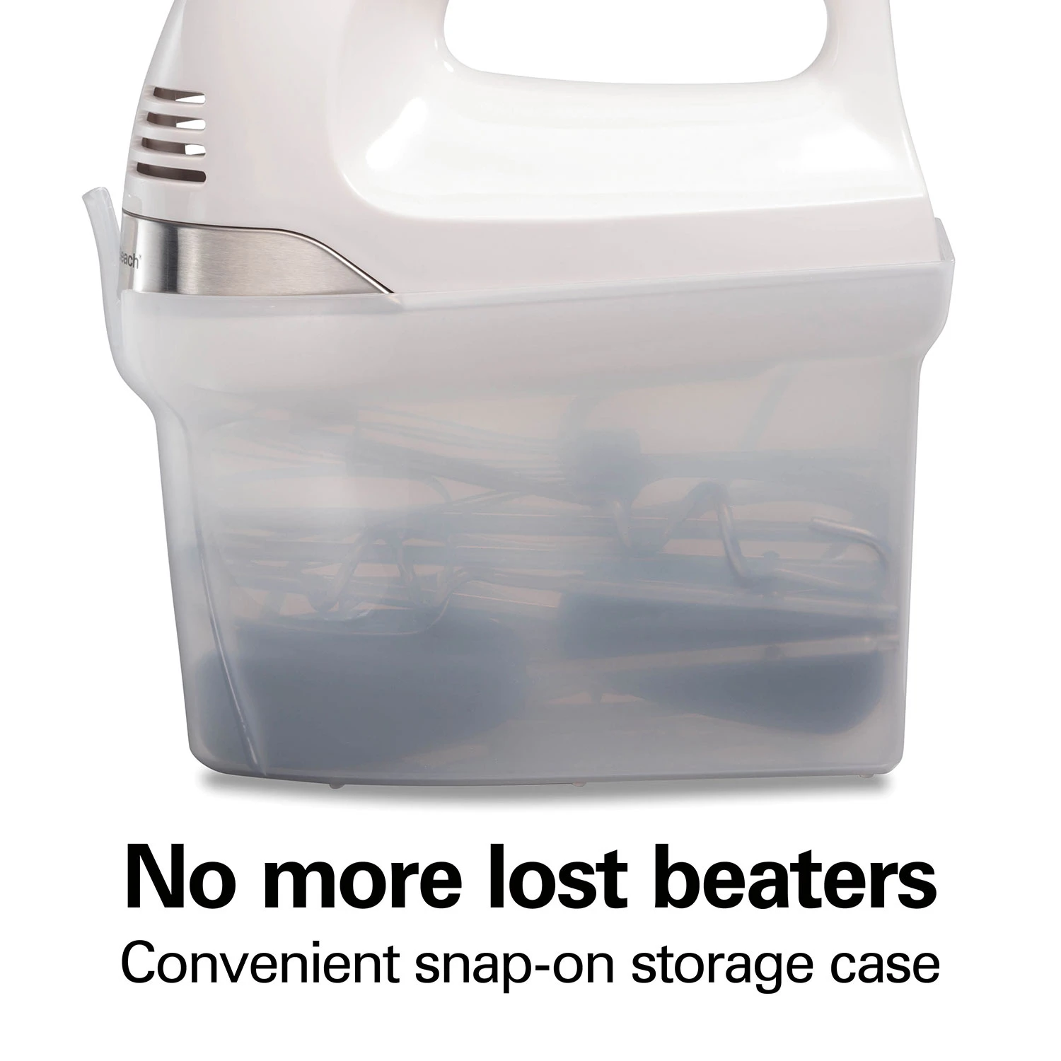The snap-on storage case of the Hamilton Beach mixer holds all the attachments, reducing the chance that they are lost or misplaced.