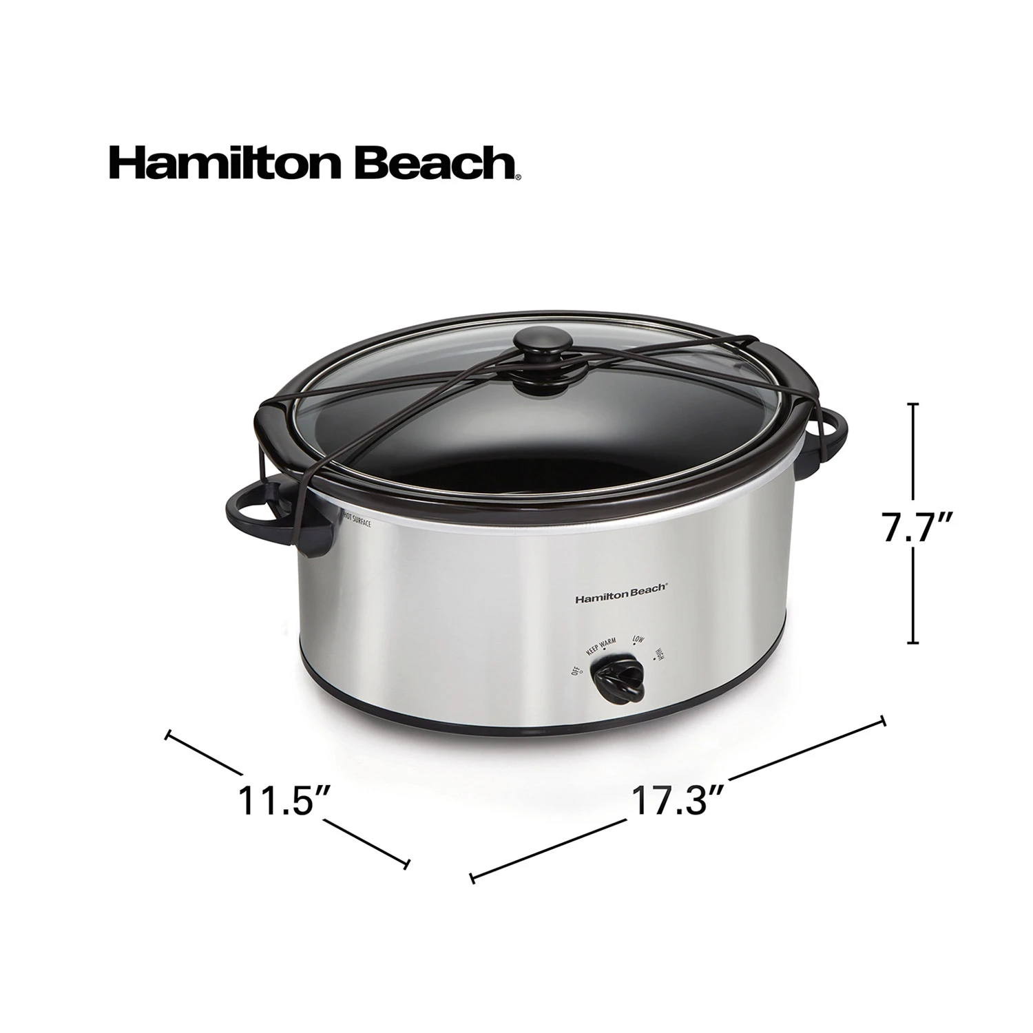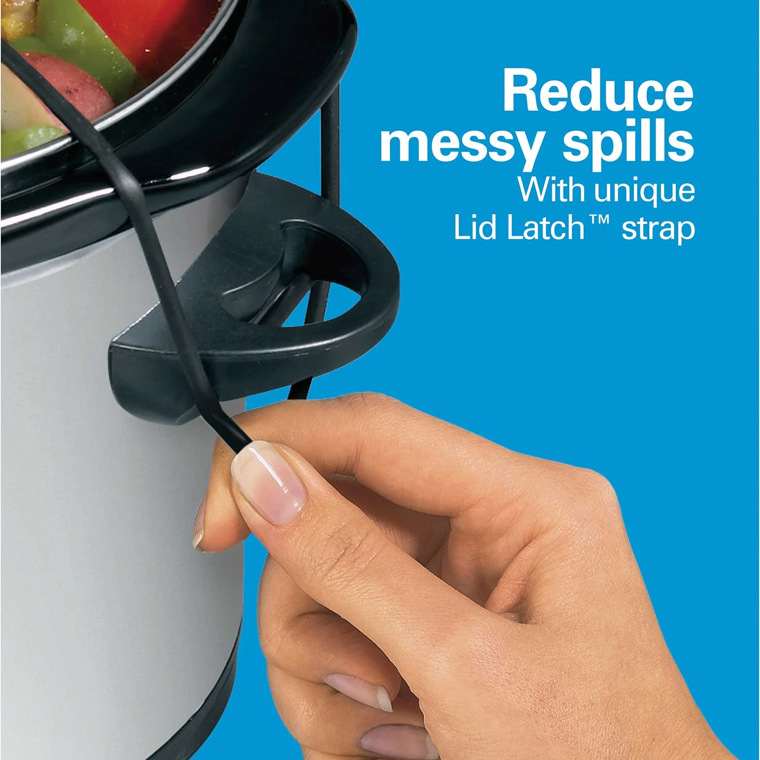 The Hamilton Beach® 7 Quart Portable Slow Cooker has a Lid Latch™ strap that attaches to the slow cooker handles to securely hold the lid in place when carrying meals. Take hot meals to family gatherings, potlucks or serve at the table without worrying about spills. The slow cooker is the perfect size for family meals and serves 8+ people. The stoneware crock fits a variety of foods, from lasagna and desserts to large cuts of meat. It holds a 7 lb. chicken or 5 lb. roast. From chili and stews to savory, slow-cooked meats and rich pasta dishes, you’ll easily make delicious, flavorful meals with minimal effort. Simply add your ingredients, turn the dial to choose your heat setting, and let the slow cooker do the rest. You’ll get great results whether you’re new to cooking or a seasoned home chef. Cook your meal on Low or High, then switch to Keep Warm when cooking is complete to maintain the ideal temperature until you’re ready to eat. The removable stoneware crock and glass lid are dishwasher safe making cleanup a breeze. The brushed silver finish with black accents looks great on the countertop.