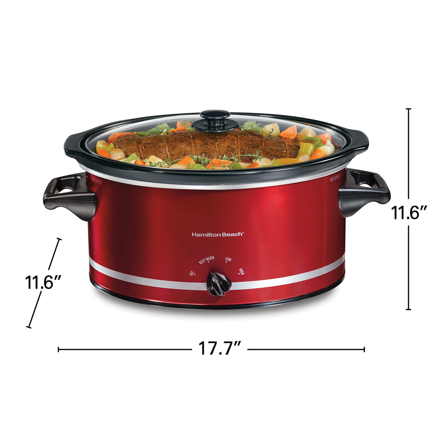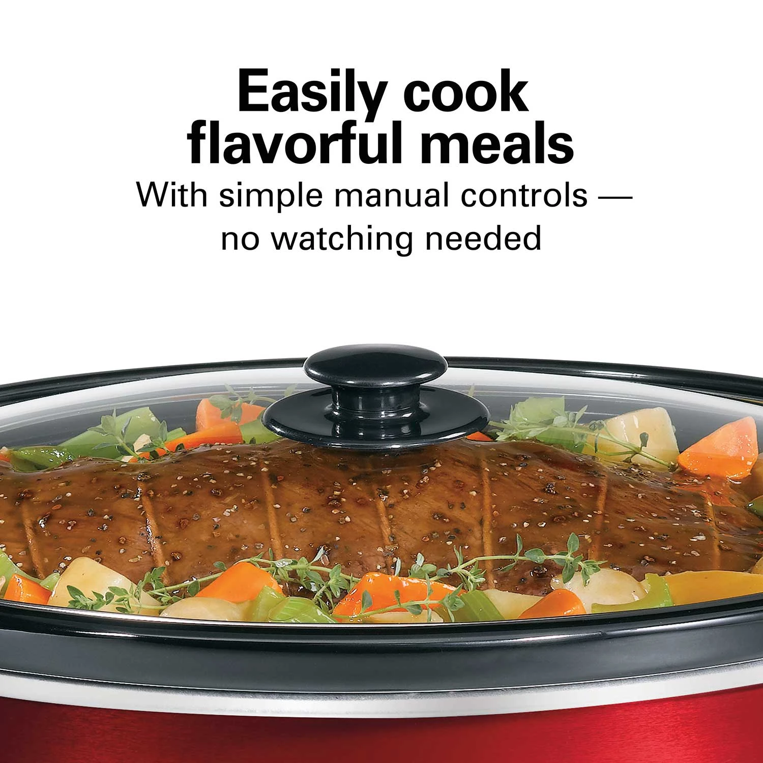 The Hamilton Beach® 8 Quart Slow Cooker is perfect for large meals, whether you’re preparing game-day chili, entertaining friends, or satisfying the appetite of a large family. The oval-shaped stoneware crock can fit a variety of foods, from chili or stew to large cuts of meat. It will hold an 8 lb. chicken or a 6 lb. roast and serves 10+ people. With simple manual controls, you can easily cook flavorful meals with minimal effort and great results, whether you’re new to cooking or a seasoned home chef. Cook your meal on Low or High and then switch to Keep Warm when cooking is complete to maintain the ideal temperature until you’re ready to eat. With full-grip handles, the slow cooker is comfortable and easy to grasp when carrying to the table to serve a meal. The removable stoneware crock and glass lid are both dishwasher safe making cleanup a breeze. The slow cooker is backed by Hamilton Beach with a 1 year limited warranty.