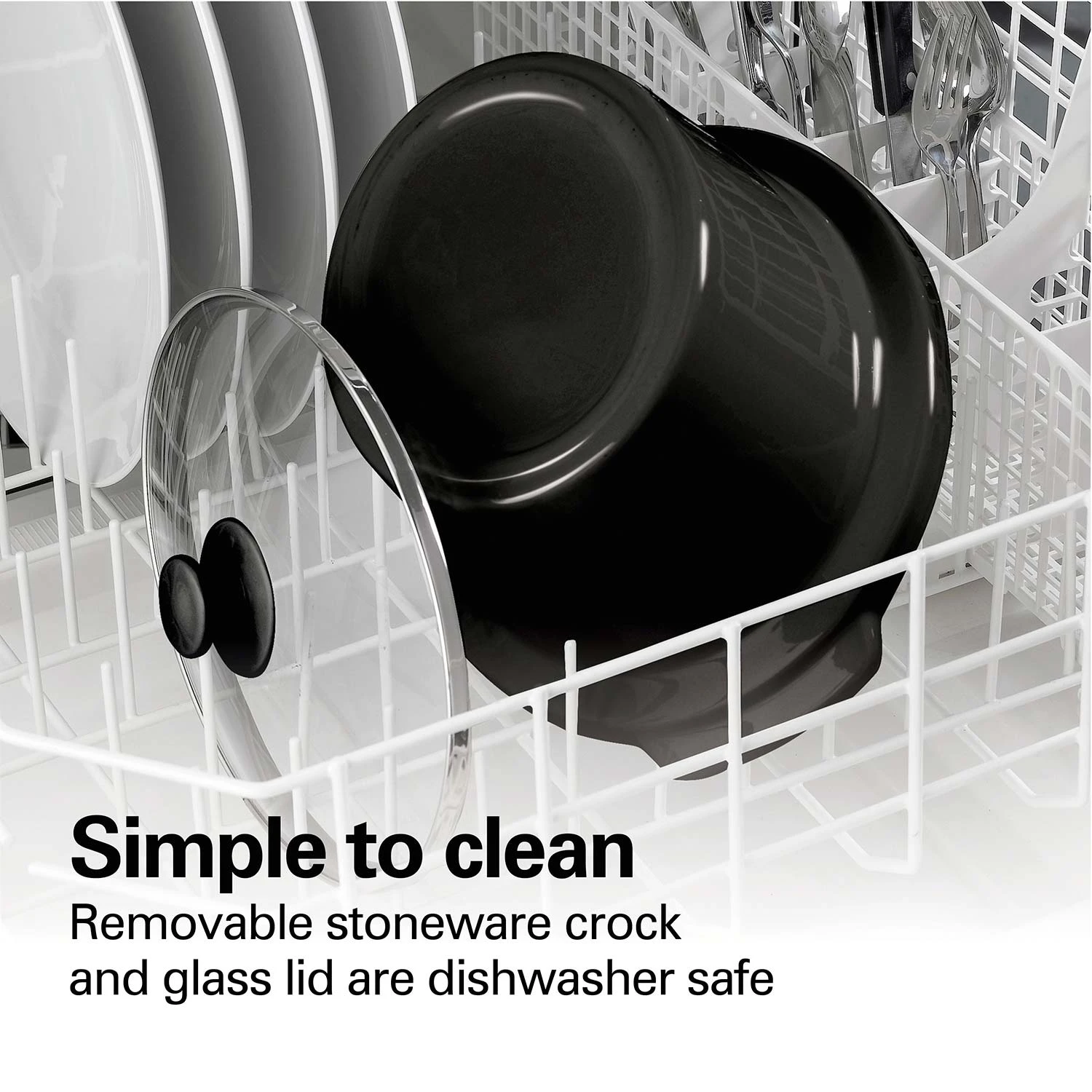 This slow cooker has a removable stoneware crock and glass lid that are dishwasher safe and easy to clean.