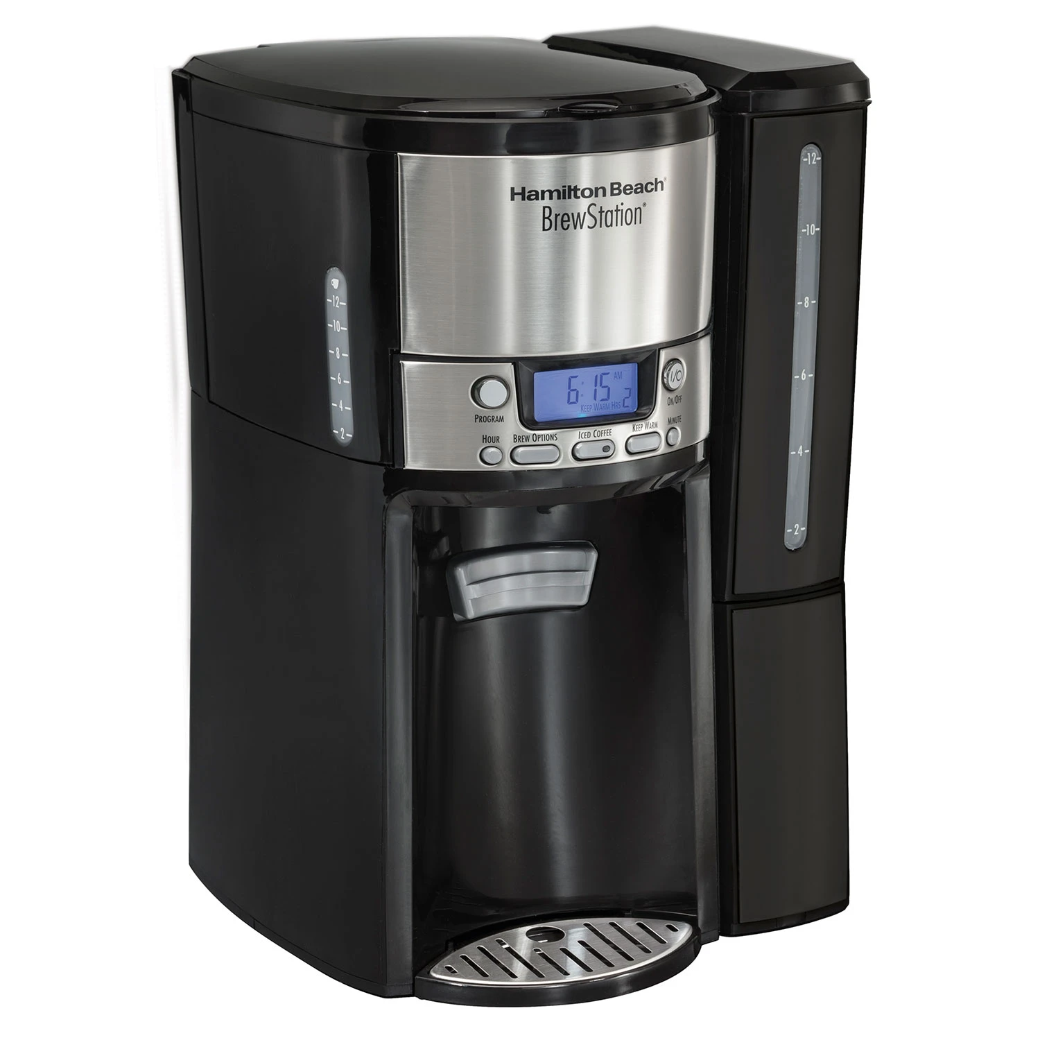 Maintain fresh-brewed flavor. No matter how much you try, it’s impossible to get freshly brewed flavor from coffee that’s been sitting on a hot plate too long. That’s why we created the Hamilton Beach BrewStation, the only coffeemaker that keeps coffee tasting fresh for up to four hours. This best-selling coffee maker works just like a traditional, automatic drip brewer, but with a notable difference: it brews into an internal tank instead of a carafe. This innovation in brewing technology is what will make your last cup taste just as fresh as the first. An internal heater keeps coffee at the perfect temperature for up to four hours, so you can refuel with a fresh, hot cup throughout your morning. And with no glass carafe, you have nothing fragile to break and replace. Instead, you can easily pour a cup with the one-handed simplicity of a dispensing bar. The BrewStation® lets you customize your cup with brewing options like bold, regular, small batches and even iced coffee. The water tank is removable for easy fill-up and cleaning. The internal tank and brew basket also remove for cleaning.