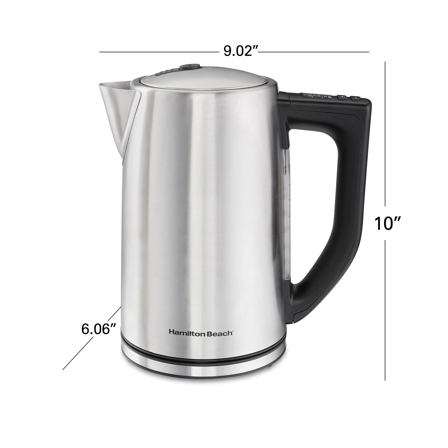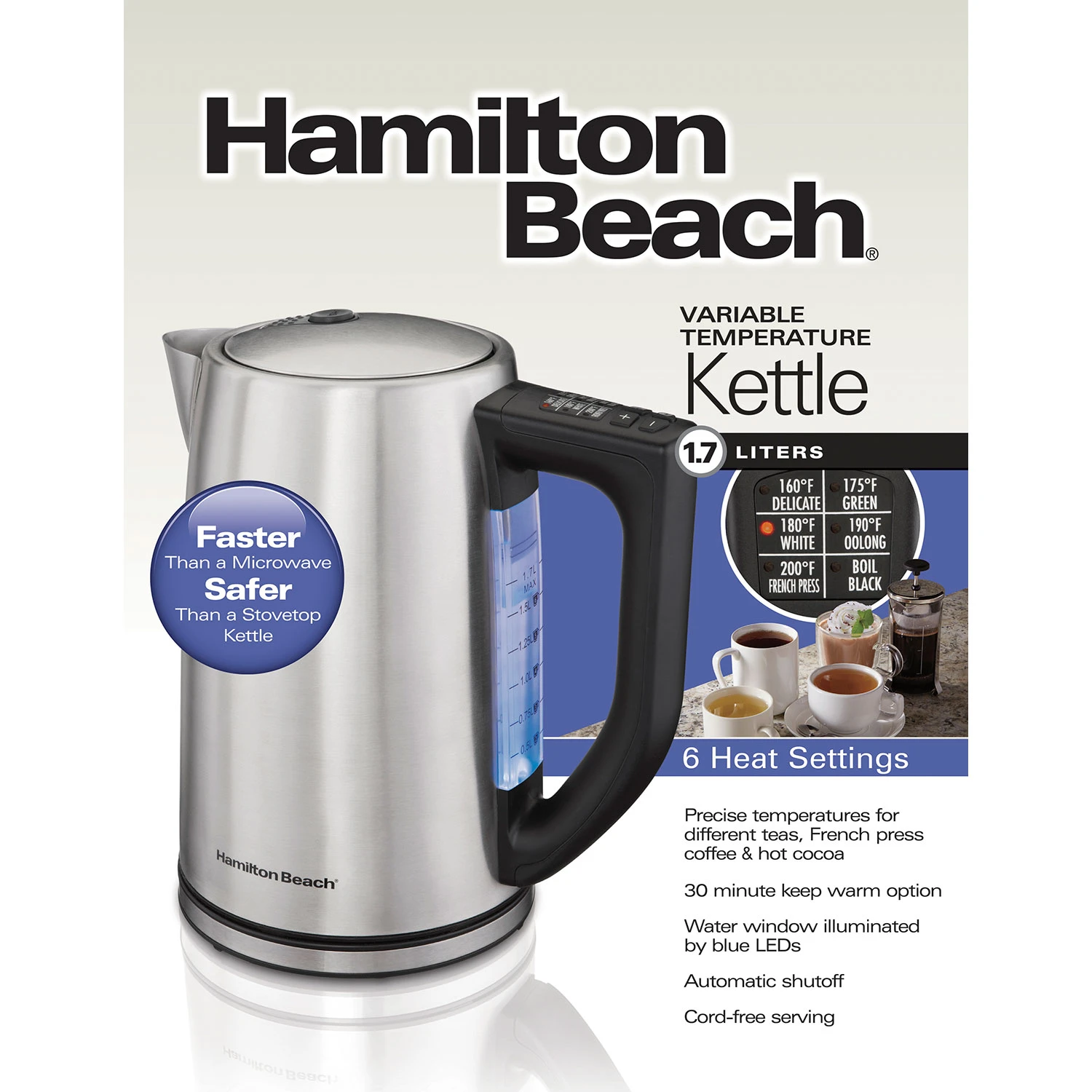For the perfect cup of tea, not just any cup of hot water will do. Because the exact temperature of your water can impact the quality of the beverage¬ – boiling water can actually scorch some delicate teas – the Hamilton Beach® Variable Temperature Kettle has six integrated one-touch temperature settings. Each corresponds to the ideal temperature for a variety of teas, plus French Press coffee. This handsome 1.7-liter brushed stainless steel kettle is faster than preparing water in a microwave and safer than the stovetop, thanks to boil-dry protection and automatic shut off. Other smart features, like a keep warm setting, cord-free serving, LED-lit water window and built-in mesh filter, make it easy to fill, serve and clean.