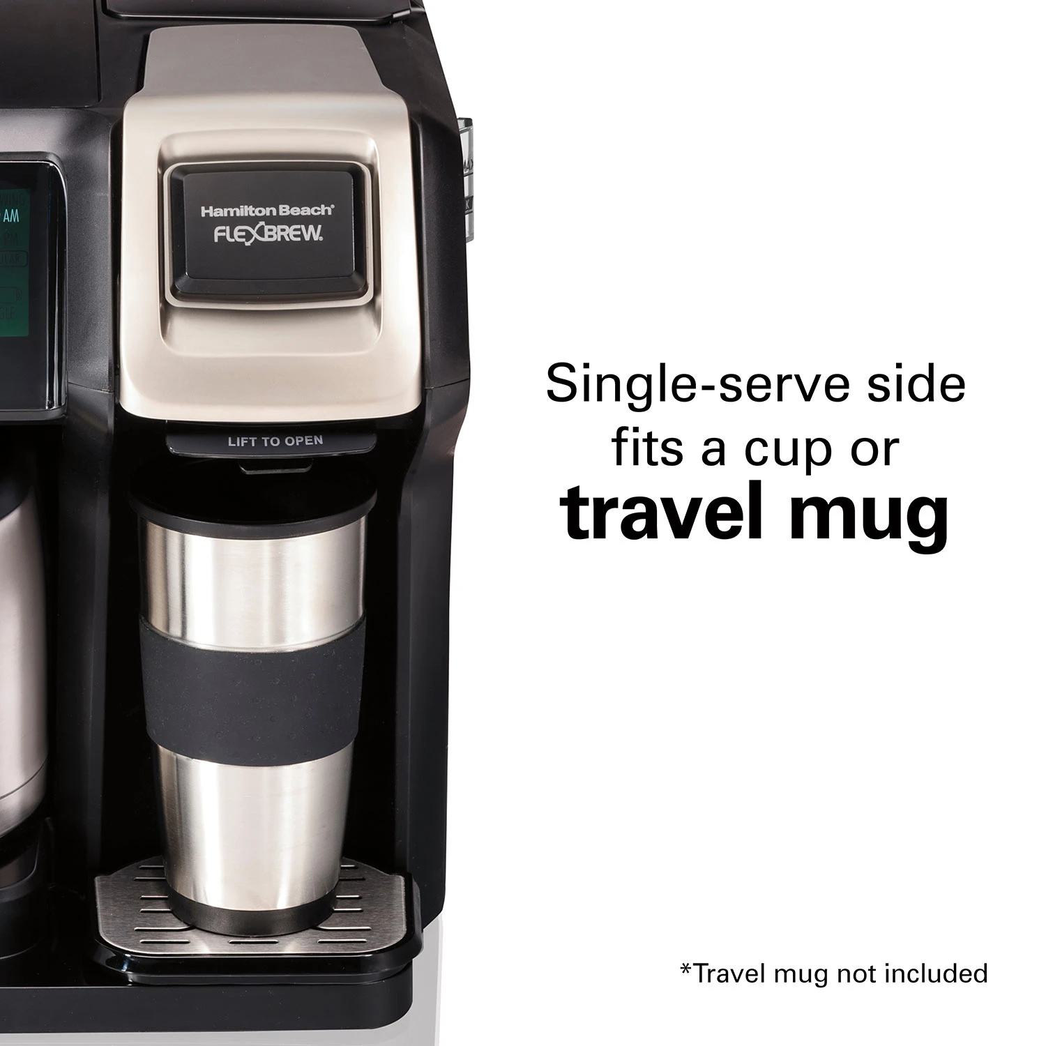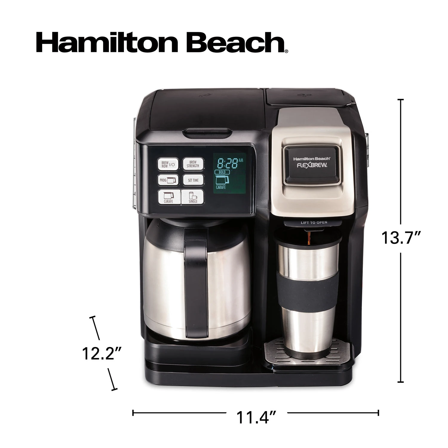The flexible Hamilton Beach® FlexBrew® Trio Coffee Maker lets you brew coffee three different ways. On the single-serving side, you have two brewing options: making coffee with your favorite brand of pod (such as a K-Cup* pod) or using ground coffee. Using a pod lets you brew up to 10 oz. of coffee, and brewing with coffee grounds lets you brew any size cup up to a 14 oz., 7″ tall travel mug. When you want more coffee, simply fill the water reservoir and brew basket on the carafe side like you would a traditional coffee maker. The 10 cup thermal carafe will keep your coffee hot, plus you can set up wake-up ready coffee with Easy-Touch programming and get your first cup fast with Auto Pause & Pour. No matter which way you brew, Select-a-Brew lets you choose bold or regular brewing strengths. The Hamilton Beach® FlexBrew® Trio Coffee Maker includes a 10 cup stainless steel thermal carafe, single-serve pod holder and single-serve brew basket.