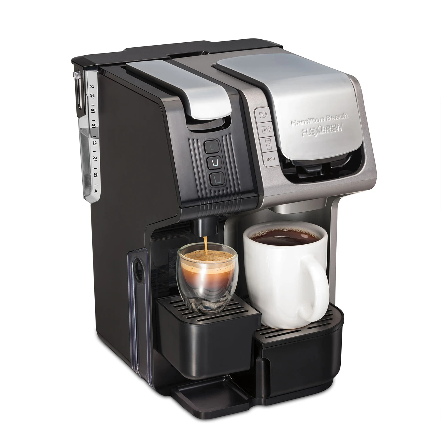 She starts the day with a shot of espresso and ends it by brewing a tall mug with a decaf pod. He prefers freshly ground Fair Trade coffee and won’t drink anything else. How do you satisfy different brewing tastes without cluttering up your whole kitchen? With the Hamilton Beach® FlexBrew® Universal Coffee Maker. Its 3-in-1 brewing capability lets you brew a cup in about a minute with a Nespresso®* capsule, K-Cup®* pod or your favorite ground coffee. With its 56 oz. water reservoir, you can brew multiple cups without refilling. The Hamilton Beach FlexBrew Universal Coffee Maker gives you the option to brew 1.35, 2.7 or 5 oz. of espresso or 8, 10 or 14 oz. of coffee with a pod or ground coffee. The powerful 19-bar pressure espresso pump provides fast brewing and creates a rich espresso crema. Includes adjustable cup rests on both sides, used espresso capsule collection bin, pod holder and ground coffee brew basket.