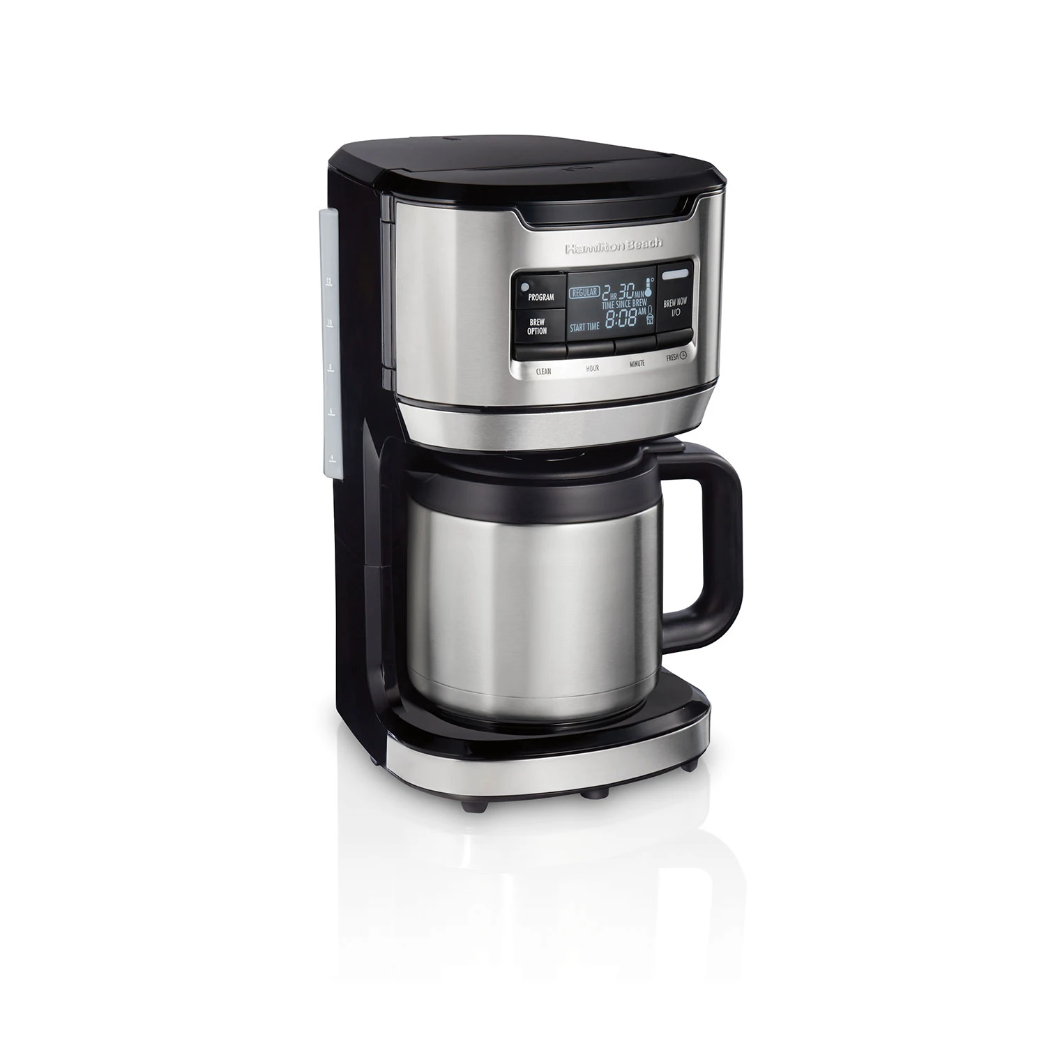 If you want your coffee to stay hot and fresh-tasting for a long time, a coffee maker with a thermal carafe is your best choice. Not only does it offer extra-large capacity, the Hamilton Beach® Programmable Front-Fill 12 Cup Coffee Maker with Thermal Carafe keeps coffee hot for up to 4 hours in its vacuum-sealed thermal carafe. The convenient front-fill® design makes it easy to add fresh ground coffee and water. Then right before you brew, quickly rinse the thermal carafe with hot water. This hot-water-rinsing step doesn’t take long, but it makes a big difference, since it warms up the stainless steel to help it hold coffee’s hot temperature longer. And because the thermal carafe is insulating your hot coffee without the need for a heating plate, there’s no fear of coffee losing its fresh, just-brewed flavor. A freshness timer shows you how long since your coffee brewed. This coffee maker comes with a gold-tone reusable filter so you don’t have to purchase paper filters. Set coffee to brew ahead with a programmable timer. And choose from 3 brewing options: bold, regular and 1-4 cups. An auto shutoff feature turns the coffee maker off after brewing stops.