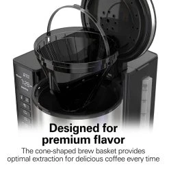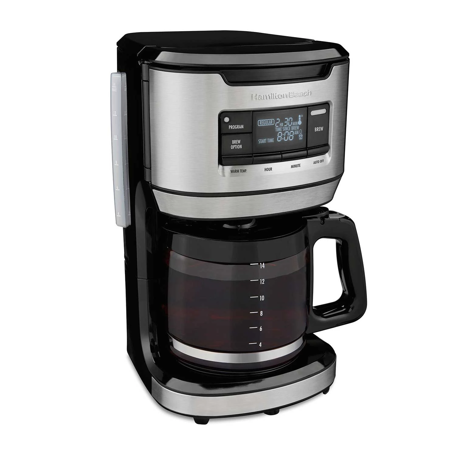 This Hamilton Beach coffee maker has 24 hour programmability for wake up ready coffee. The “Time Since Brew” freshness indicator lets you know how long ago coffee brewed. Know when it’s time to clean with the cleaning cycle reminder.