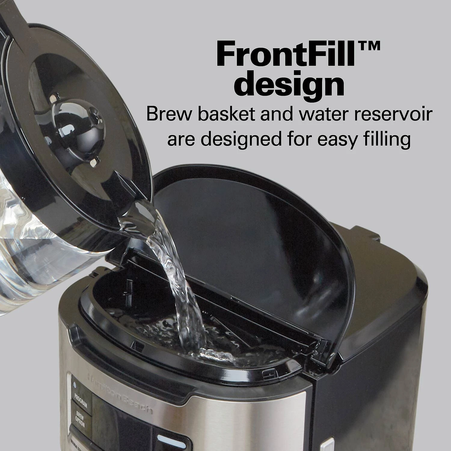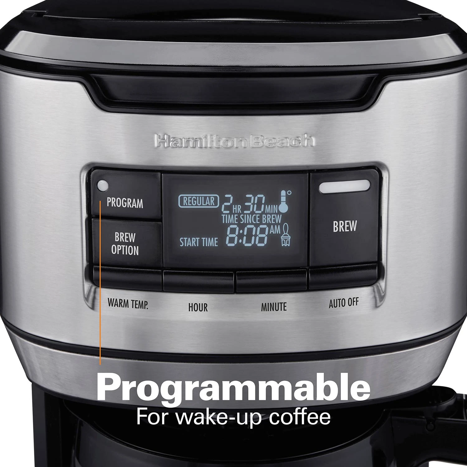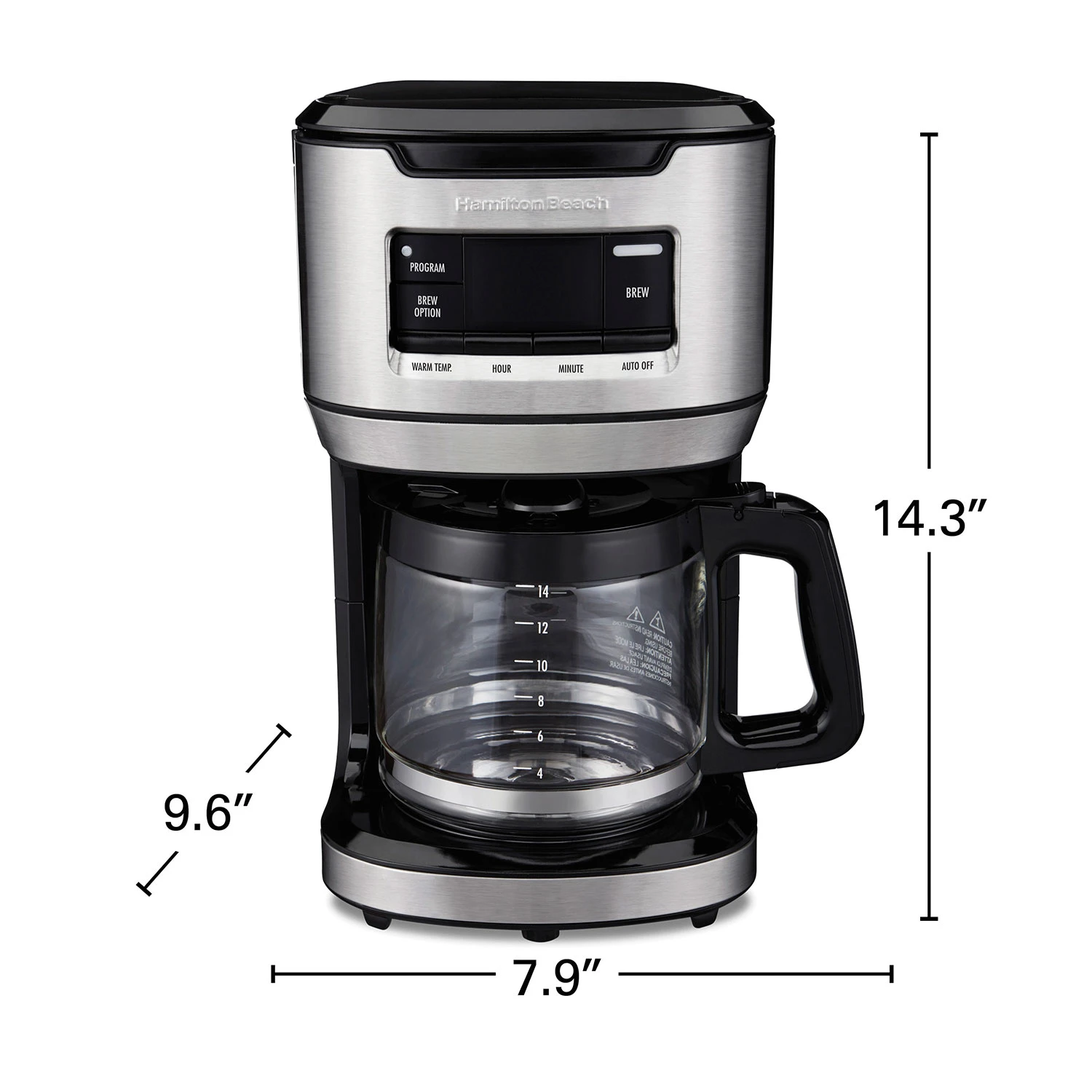 The Hamilton Beach® 14 Cup Programmable Coffee Maker features a FrontFill® design. The FrontFill® water reservoir and swing-open brew basket are designed for easy filling under cabinets. The reusable cone filter with handle makes it easy to dispose of messy grounds and maximizes coffee flavor, while the included charcoal water filter removes impurities. The drip-free carafe is specially designed for easy drip-free pouring, even when the pot is full. Programming options allow you to set wake-up ready coffee in advance while choosing from 3 brew strength options: regular, bold, and 1–4 cups. Adjustable keep-warm function keeps coffee at the right temperature and 0-4 hour adjustable auto shutoff for peace of mind.
