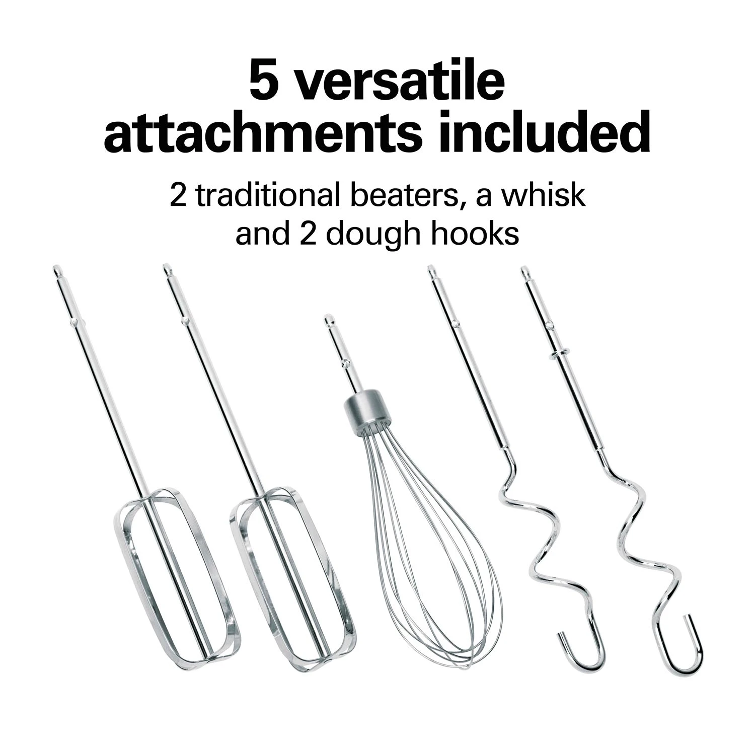 With the Hamilton Beach® Power Deluxe™ 6 Speed Stand Mixer, you get two products in one space-saving appliance. Mixing a batch of bread or cookie dough? Let the stand mixer do the work. Whipping up a quick dressing? Unlock the hand mixer from the base for the fast results you want. The stand and hand mixer has a powerful 275 watt peak power motor for all your mixing needs. As you mix, the Shift & Stir™ bowl rotating lever lets you rotate the bowl from side to side for thorough mixing. The Bowl Rest™ feature stabilizes the hand mixer on the side of the bowl to reduce messy drips and free your hands to add ingredients. The mixer includes 5 dishwasher safe attachments: 2 traditional beaters, a whisk and 2 dough hooks. Easily handle a wide range of mixing jobs with 6 speeds, and the QuickBurst™ button provides an extra burst of power at any speed. The durable 4 quart (3.8 L) clear glass bowl makes it easy to see ingredients as they mix. The bowl easily accommodates most recipes and is dishwasher safe for easy cleanup. Brought to you by America’s #1 stand/hand mixer brand.*