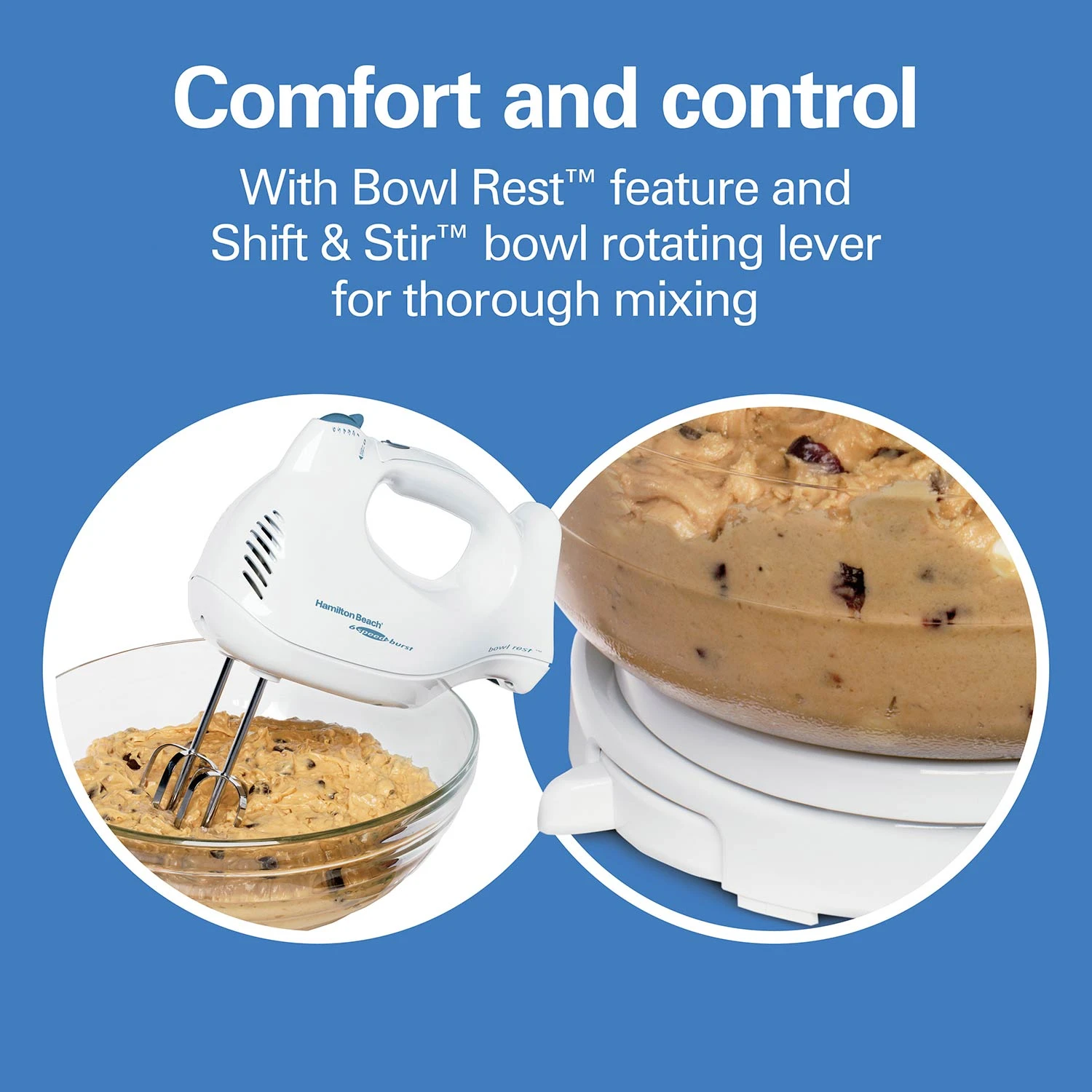 As you mix, the Shift & Stir™ bowl rotating lever turns the bowl from side to side for thorough mixing. The Bowl Rest™ feature stabilizes the hand mixer on the side of the bowl to reduce drips and free your hands to add ingredients.