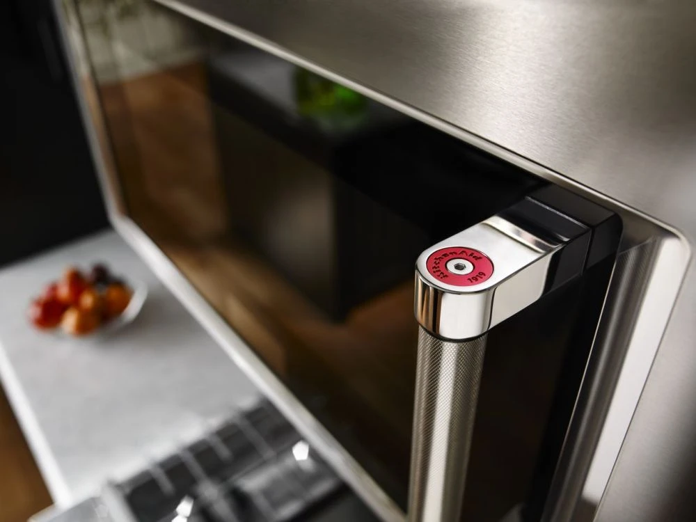- A bold blend of professionally-inspired styling with sleek touches for the home. This microwave oven features Satin Textured Handles, Precision Glass Touch Controls, a Chrome Inlaid Frame, the KitchenAid Badge and KitchenAid Brand Medallion
