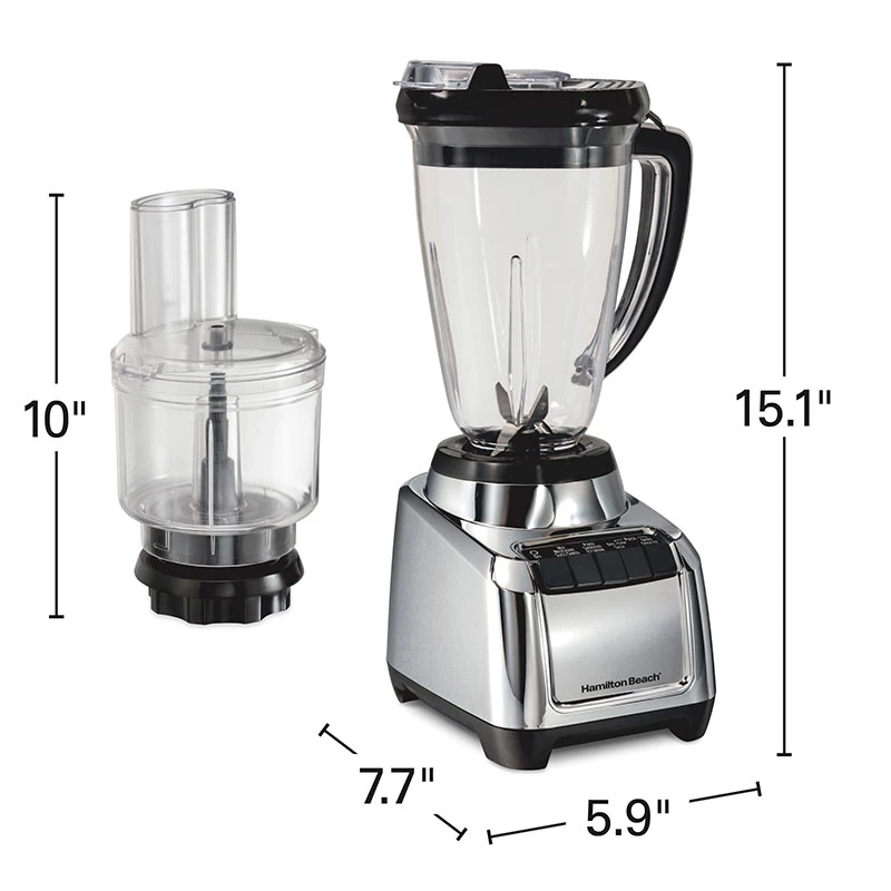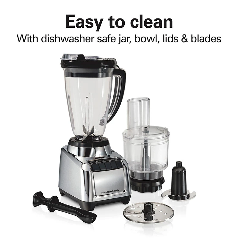 The large, BPA-free MultiBlend® jar is perfect for blending both icy drinks, like fruit smoothies and protein shakes, and for prepping foods like soups, dips, batters, dressings and sauces. Easily swap the jar for the 3 cup food processor attachment to chop fresh vegetables or mince garlic for a stir fry. The food processor bowl includes a chute and food pusher to make adding foods easy. The blender jar, food processor bowl, lids, blades and accessories are all dishwasher safe for easy cleanup. Built for long-lasting performance and backed by Hamilton Beach with a 3 year limited warranty.