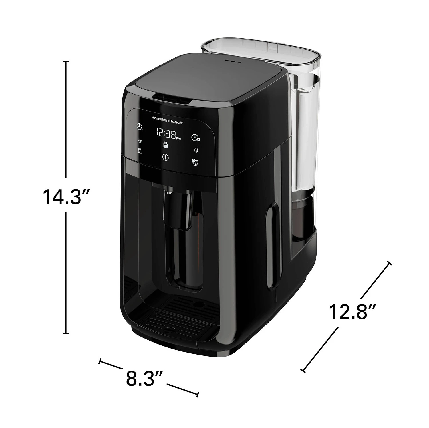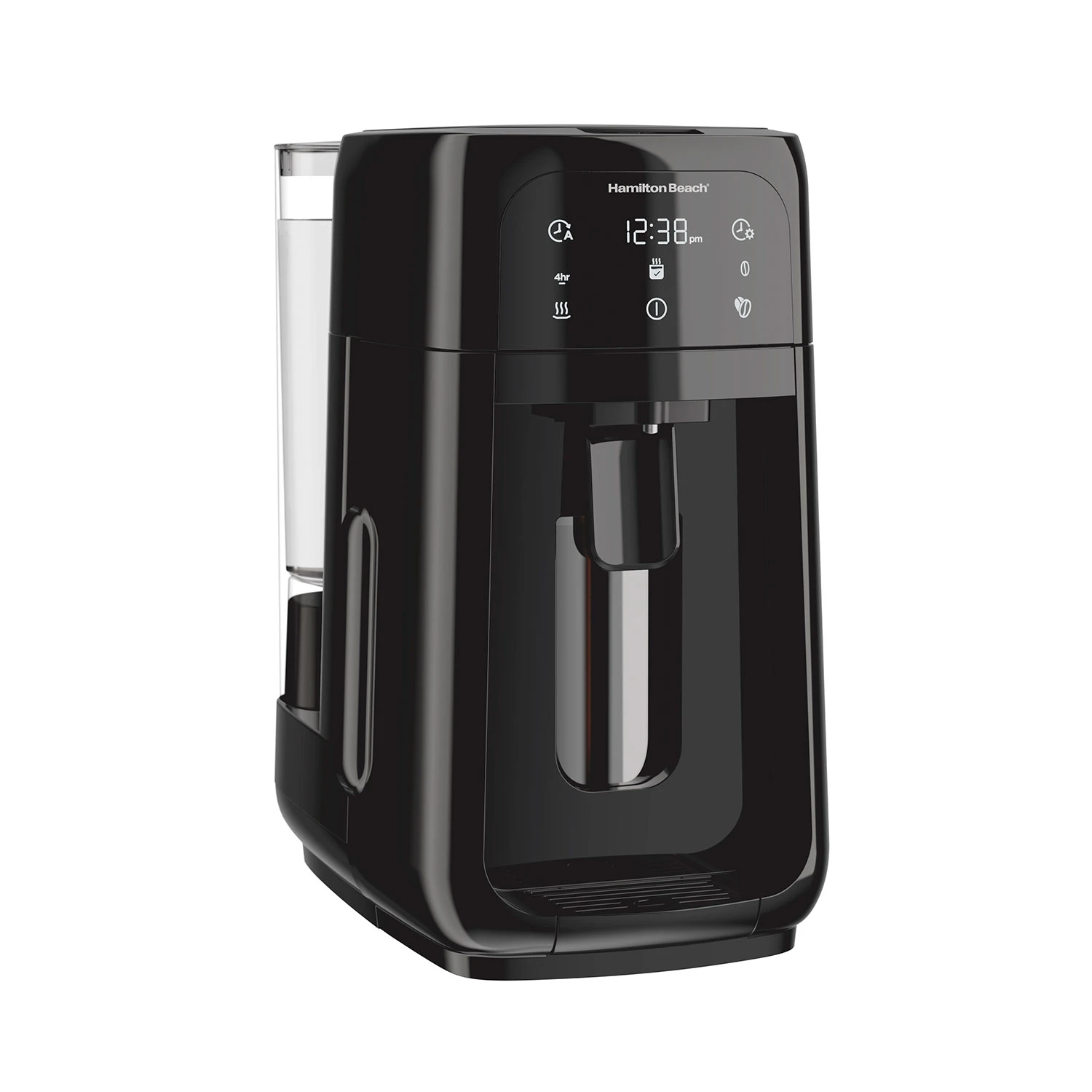 Enjoy fresh flavor for longer with the Hamilton Beach® One Press® Dispensing Coffee Maker. It conveniently dispenses fresh, delicious coffee into your favorite cups or travel mugs up to 7″ tall with one press of the lever. Since there’s no carafe, there’s no spilling, pouring or making a mess. The internal warming heater keeps coffee warm and fresh for hours in the durable borosilicate glass reservoir where coffee won’t burn or scorch. The front-facing window lets you easily see the coffee level in the 12 cup coffee reservoir. Programmable settings give you ultimate brewing control.