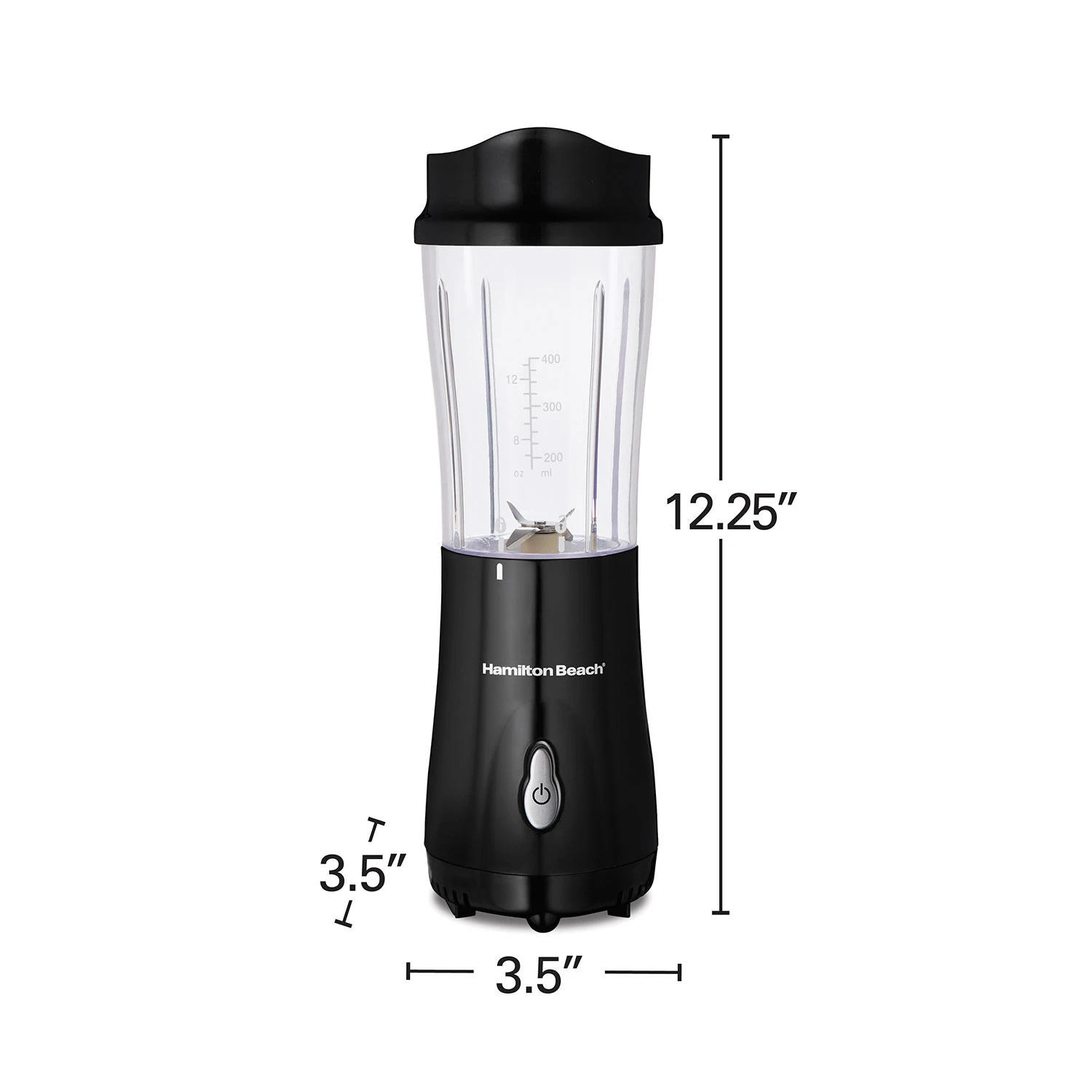 Hamilton Beach® Personal Creations Blender with Travel Lid Bring your smoothie or shake wherever your day takes you. If smoothies and protein shakes are a staple in your diet, life just got a little easier. The Hamilton Beach Personal Creations™ Blender with Travel Lid lets you blend and run. Since the blending jar is also a travel mug with lid, there is no need to find the right cup or spend time cleaning up the blender before leaving the house. Instead, just remove the jar from the base, and you’re ready to go. The 14 ounce travel mug includes measuring marks up the side, and it fits most car cup holders for safe, secure transport. When you’re done with your drink, the cup and lid can be safely run through the dishwasher. In addition to convenient single-serving shakes and smoothies, the Hamilton Beach Personal Creations Blender with Travel Lid can be used to make dressings, sauces, chutneys and small-batch salsas, as well as grinding small amounts of flax seed, oats, or other seeds. Simple one-touch blending and durable stainless-steel blades make for fast, consistent results. The Hamilton Beach Personal Creations Blender with Travel Lid allows you to make smoothies, shakes, dressings, small-batch salsas and more to your desired consistency and taste with simply the press of a button. The stainless steel blades can easily cut through ice and frozen fruit, delivering smooth, consistent results every time. Portable and Compact This single-serve blender provides ultimate drink versatility and portability. The blending jar doubles as a detachable travel mug with lid that lets you drink straight from the jar and fits in most car cup holders. Extremely compact, it’s perfect for traveling with you to work, games or sporting events, and it’s ideal for small living spaces like apartments and dorms. Convenient, Healthy Options The Hamilton Beach Single-Serve Blender delivers the satisfaction of a perfectly portioned, healthy treat in delicious drink form. It comes with measuring lines on the front of the BPA-free jar, which gives you the ability to guess less and blend more.