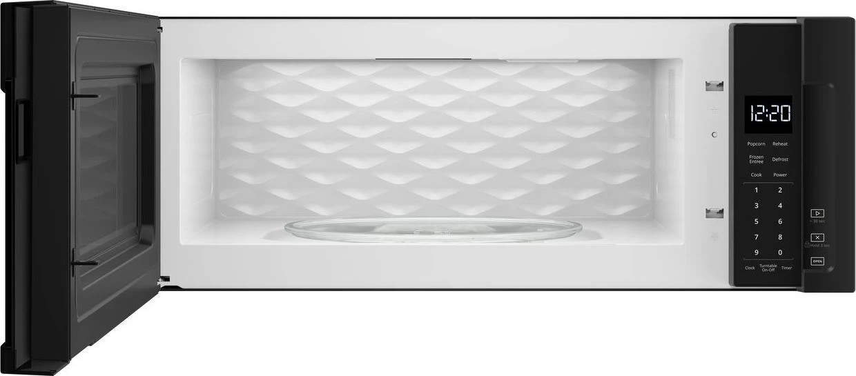 - Controls stay out of the way and easy to clean with a smooth touch panel that’s hidden behind the microwave door for a modern look.