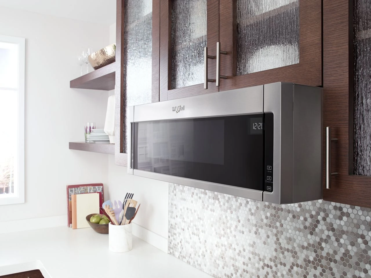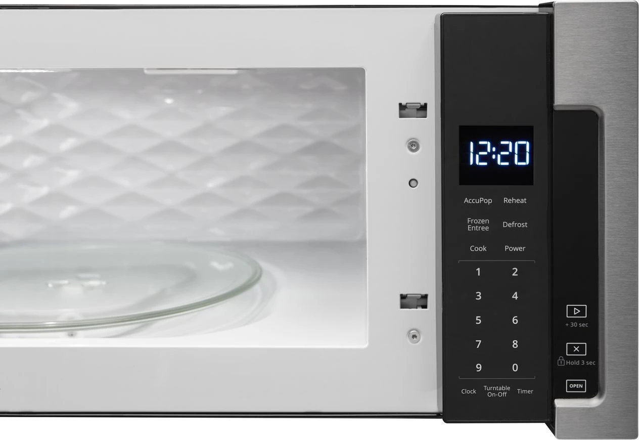 - Controls stay out of the way and easy to clean with a smooth touch panel that’s hidden behind the microwave door for a modern look.